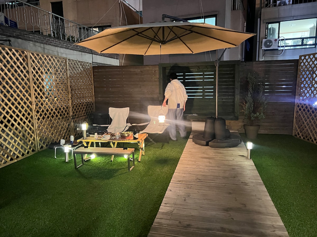 ★My house is located 3mins from Hongdae station. Perfect place for trasportation convenience. There is a cozy parasol and a drawing-room in the rooftop of our house for 16 people. BBQ is equipped with facilities to enjoy comfortably. -Near Hongdae neighborhood, Yeonnam-dong, Hongdae street has fancy cafes and restaurants, exciting bars and clubs. -You can directly come to Hongik University Station by AREX from inchen international Airport We promise to provide the cleanest room . Welcome.