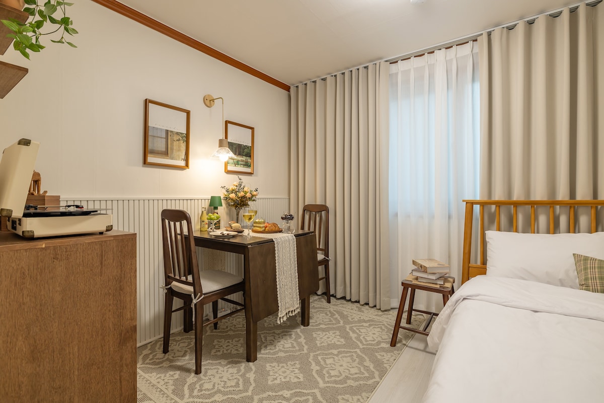 🤍 홍대의 조용한 골목에 자리한, 밖에 나가지 않아도 하루가 충분한 따뜻한 감성 하우스입니다. 디자이너가 조명·컬러·가구를 직접 디렉팅해 겨울에도 오래 머물고 싶어지는 부드러운 무드를 담았어요. 🤍 대형 빔프로젝터와 코타츠 테이블이 준비되어 있어 추운 날엔 외출 대신 영화 한 편과 함께 아늑한 밤을 보내기 좋아요. 2층 침대(프라이버시 분리)와 퀸 침대 구성으로 둘이 넉넉하게, 또는 소규모로 편안하게 머무실 수 있습니다. 🤍 홍대·신촌 도보 접근이 가능하면서도 밤에는 조용한 골목에 위치해 공연·전시 후에도 편하게 쉬실 수 있어요. 지하철·공항철도, 주요 관광지 이동도 편리하고 편의점은 도보 1분 거리입니다. 🤍 신축 건물의 깔끔함에 전문 청소 관리, 100% 순면 침구, 공기청정기까지 갖춰 겨울철 컨디션에 민감한 분들도 안심하고 머무를 수 있는 환경을 준비했습니다.