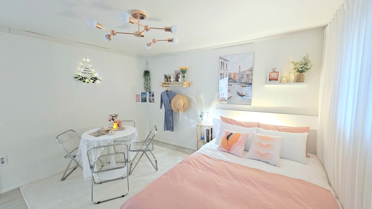 홍대 7번 출구에서 도보 1분. 조용한 골목 안, 파스텔빛 감성의 2룸 스테이 ONDa에 오신 걸 환영해요. 식물과 햇살이 함께하는 부엌, 커피 한 잔과 함께 하루를 시작할 수 있는 테이블, 편히 쉴 수 있는 따뜻한 침실이 준비되어 있어요. 세탁기/건조기, 스마트TV, 커피머신, 와이파이 완비 셀프 체크인 & 키패드 도어락 감성 셀카존 (벽걸이 그림과 테이블 코너) ONDa — 머물고 싶은 순간이 오는 곳!