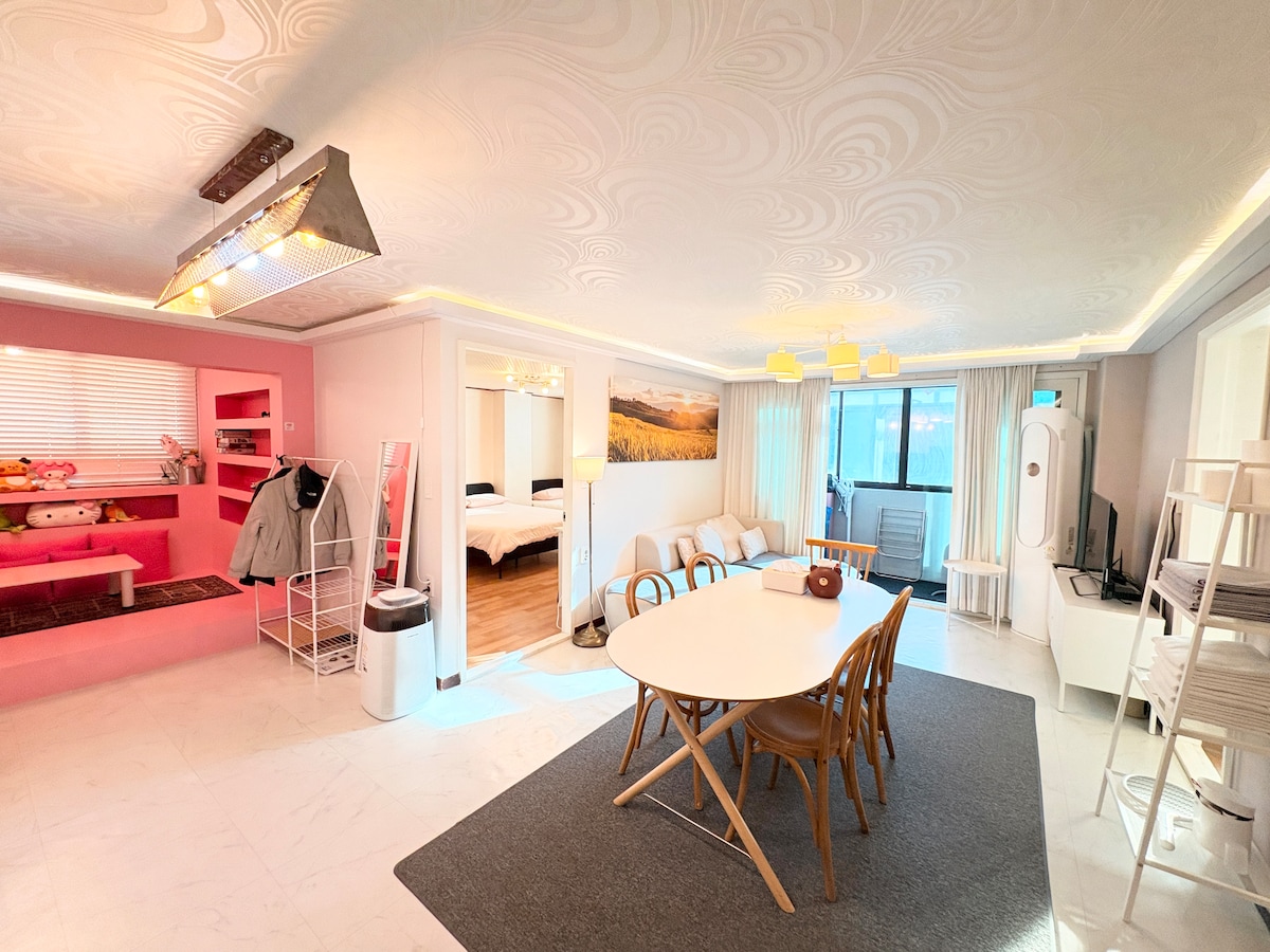 弘大繁华街 离弘大站9号出口5分钟。热门位置 2间客房整套房源、客厅、厨房 阳光明媚