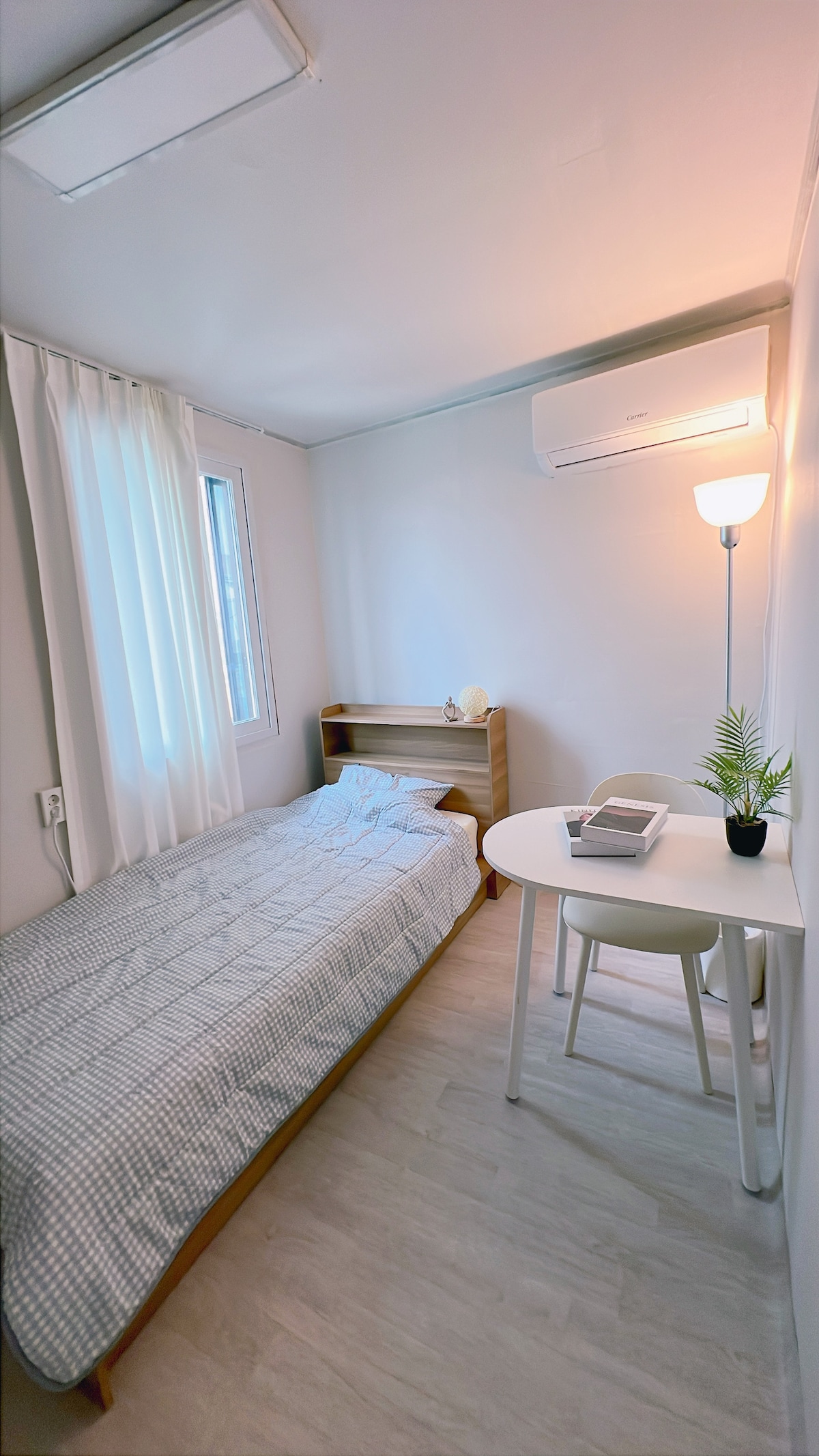 '- 房间24.75平方米,床135*200,书桌1070*700,可以保管行李 - 具备可办公、可做饭的简单餐具,智能电视 50 英寸 - Wifi, 大衣柜, 大冰箱, 洗衣机, 晾衣架, 吹风机, 毛巾, 纸巾, 水 收费停车 洗发水、沐浴露、护发素、香皂 - 从仁川机场到宿舍正门乘坐机场巴士时56分钟(包括6分钟步行) - 从宿舍可以走着去的地方 大创(6分钟),OLIVE YOUNG(3分钟),时代广场(3分钟),汗蒸房(6分钟) -从宿舍坐地铁去的地方 (附近有 1 号线永登浦站、2 号线文来站、5 号线永登浦市场站) 东大门 DDP(41 分钟),汝矣岛汉江公园(21 分钟),清溪川(41 分钟),景福宫(39 分钟) 弘益大学入口站(24分钟),北村韩屋村(41分钟),明洞(36分钟),圣水洞(47分钟) 文来洞(12分钟),永登浦站是KTX停车站,去釜山等地方很方便。 清晨感受着从窗户照进来的温暖阳光 晚上坐在房间的窗边享受时代广场的夜景