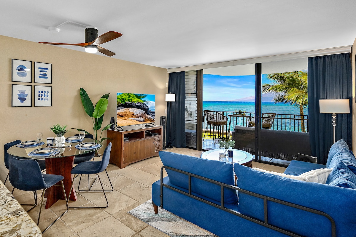 *Available for booking! Thankfully, our condo is not located in the wildfire affected area* Enjoy breathtaking panoramic views in this remodeled oceanfront corner condo located on Kahana Beach! With floor-to-ceiling windows in both the living and bedroom, gentle breezes and sunsets can be enjoyed lounging on the couch or relaxing in bed. Imagine falling asleep to the lull of ocean waves at your feet and waking to spouting whales in the background. Truly an oasis on the Valley Isle.