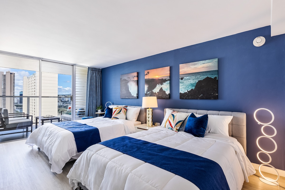 Book in the heart of Waikiki on a high floor with ocean views, a TWO MINUTE walk to the main beach & shops! Paradise is calling! Enjoy a cup of coffee while taking in the sweeping partial ocean, mountain, and city views. Our private and airy studio boasts a plush queen bed, firm twin sofa bed (recommended for a guest 5'9 or under), full bath & kitchenette. High-speed internet for streaming your favorite movies or catching up on remote work life. Reserve now before we're fully booked!