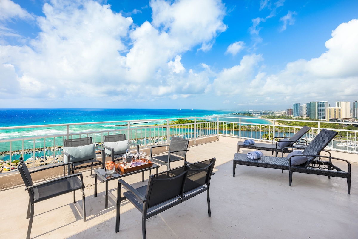 32楼顶层公寓。步行3分钟即可抵达威基基海滩