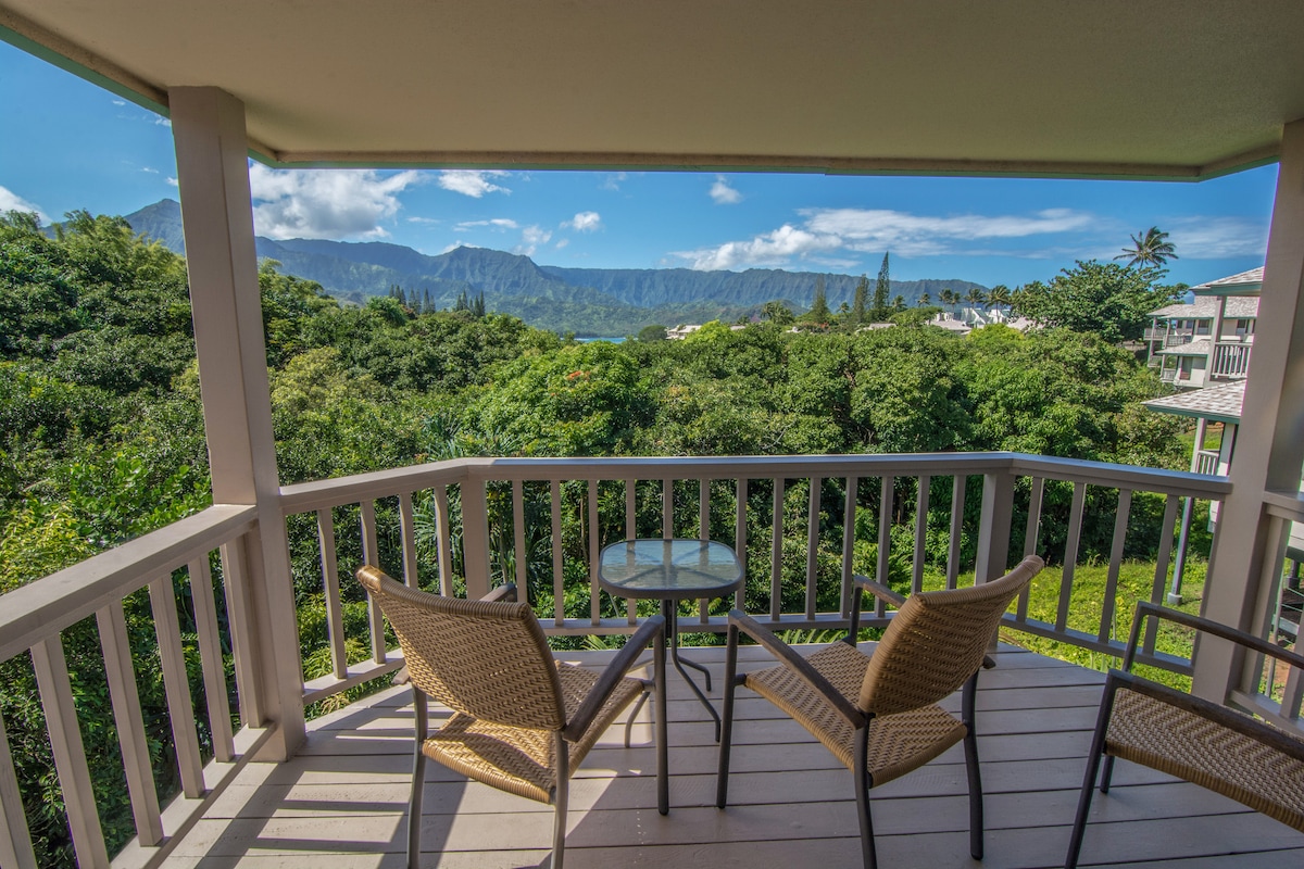 Step into tranquility in this exquisite two story Princeville Hawaii locale, nestled a stone's throw away from the a perfect locals beach, Hideaways. A leisurely stroll will escort you to the iconic 1Hotel. Indulge in captivating sunset ocean vistas out front and be embraced by majestic mountains and cascading waterfalls from the back two lanais (decks). Hanalei, Queens Bath, Anini, & the Napali Coast are yours to explore near home, and the rest of Kauai is always close. Tropical nights await