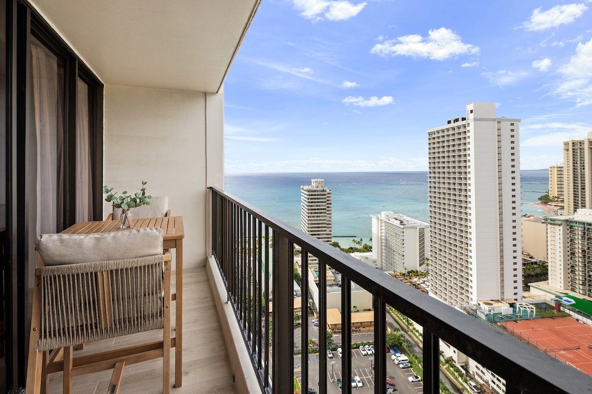 Newly renovated 1-bedroom with stunning panoramic ocean views! Enjoy an open concept layout with a king bed, full-size appliances, and a sofa bed in the living room. Features include central AC, fast WiFi, TVs in both rooms, and a large pocket door for privacy. A Juliet balcony to take in the ocean view including the Friday night fireworks. Walk to Ala Moana Mall, Hilton Hotel, and Duke’s Lagoon plus more Garage parking available for $33 a night 24/7 security, laundry room in building