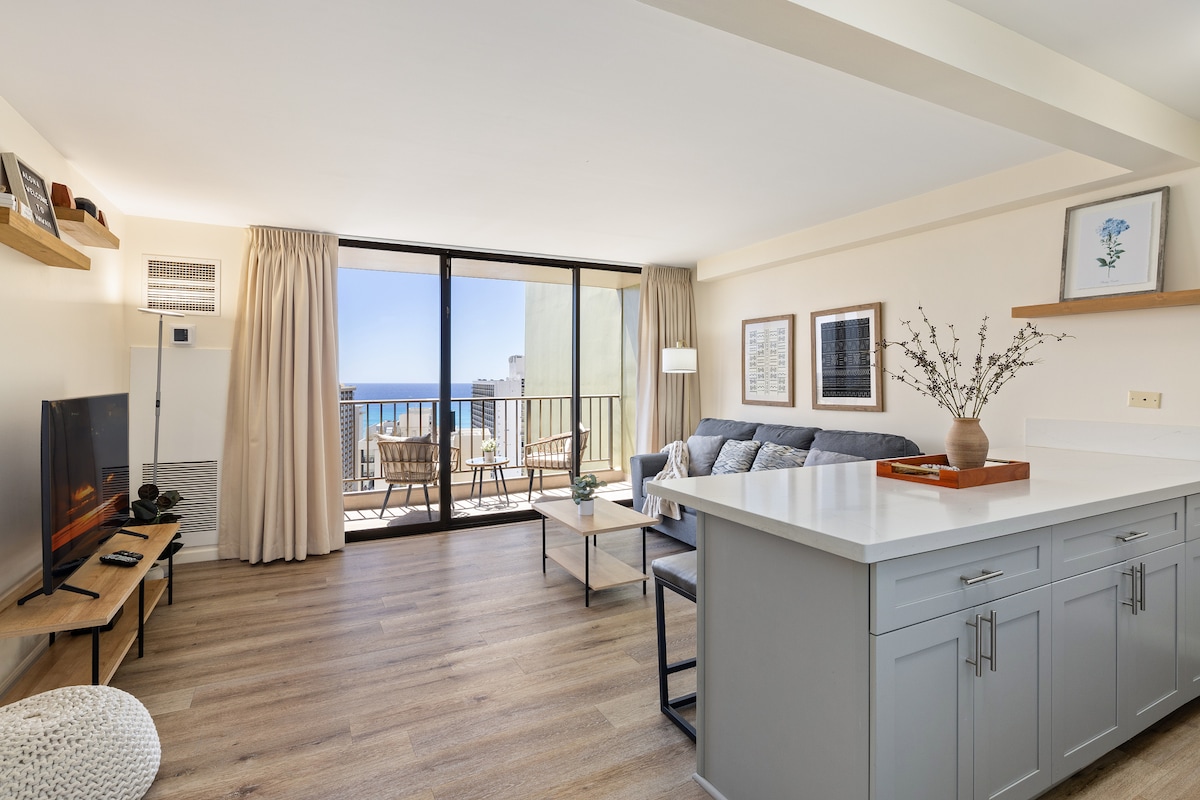 Newly renovated 1-bedroom with stunning panoramic ocean views! Enjoy an open concept layout with a king bed, full-size appliances, and a sofa bed in the living room. Features include central AC, fast WiFi, TVs in both rooms, and a large pocket door for privacy. A Juliet balcony to take in the ocean view including the Friday night fireworks. Walk to Ala Moana Mall, Hilton Hotel, and Duke’s Lagoon plus more Garage parking available for $33 a night 24/7 security, laundry room in building