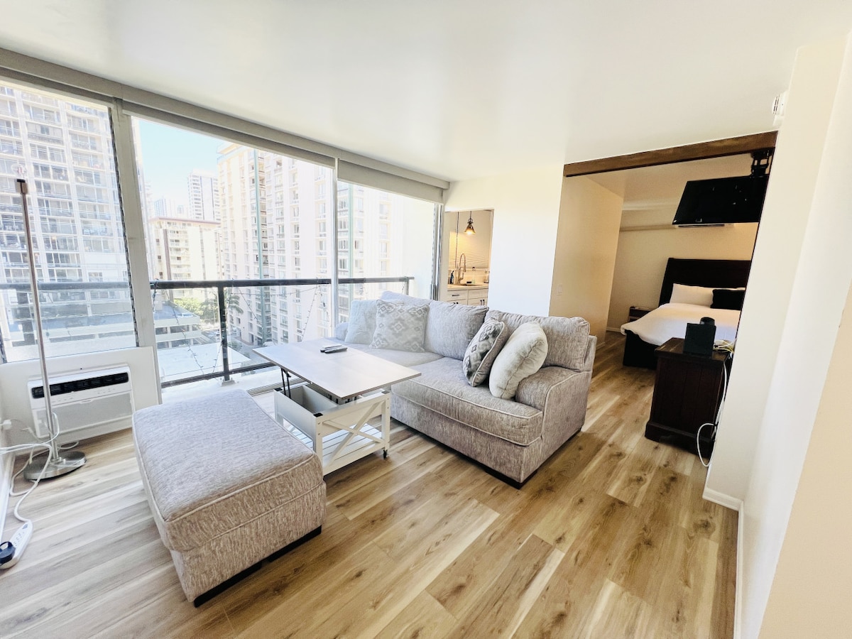 Renovated 1 bedroom/1 bathroom top floor apt in Waikiki. Beautiful 180 unobstructed panoramic ocean views from the Juliet balcony. See the Friday night fireworks and the sunset from the top! Queen size bed in bedroom. Bathroom has double sink, glass walk-in shower. Fully stocked kitchen. 24/7 security on site. Central A/C, Cable, WiFi included. Garage parking available for $35 a day. Five minute walk to Waikiki beach, Hilton hotel, Duke lagoon, and Ala Moana mall