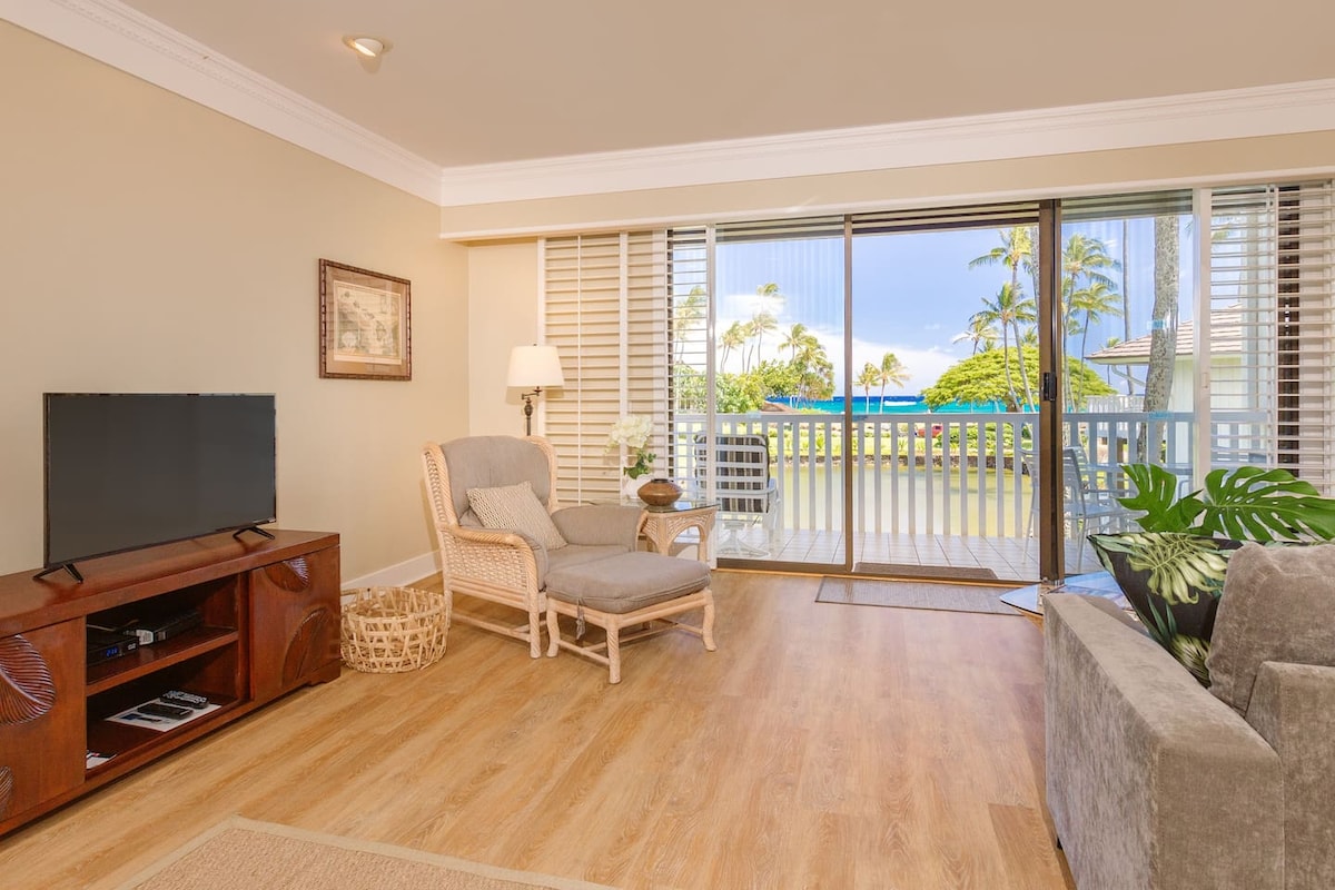 Remodeled bright & breezy top floor, corner unit in exclusive Bld 23. Steps away from top rated Poipu Beach. Privacy. Whole home A/C (dual split in living & window unit in bdrm). Fast Wifi. King bed, queen sleeper sofa & twin in the living room comfortably sleeps up to 4 people. Updated furniture and appliances. 65” Smart tv. Filled w/extra amenities, beach gear, fully equipped kitchen, cooking staples suggested experiences & babysitting recs around the island, offering a priceless stay