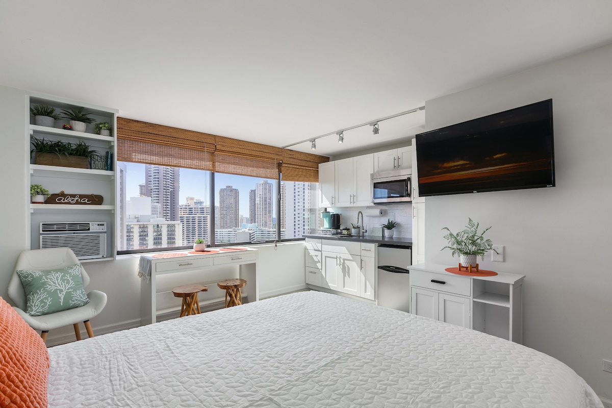 舒适的天空单间公寓B,位于35楼,享有威基基海景!