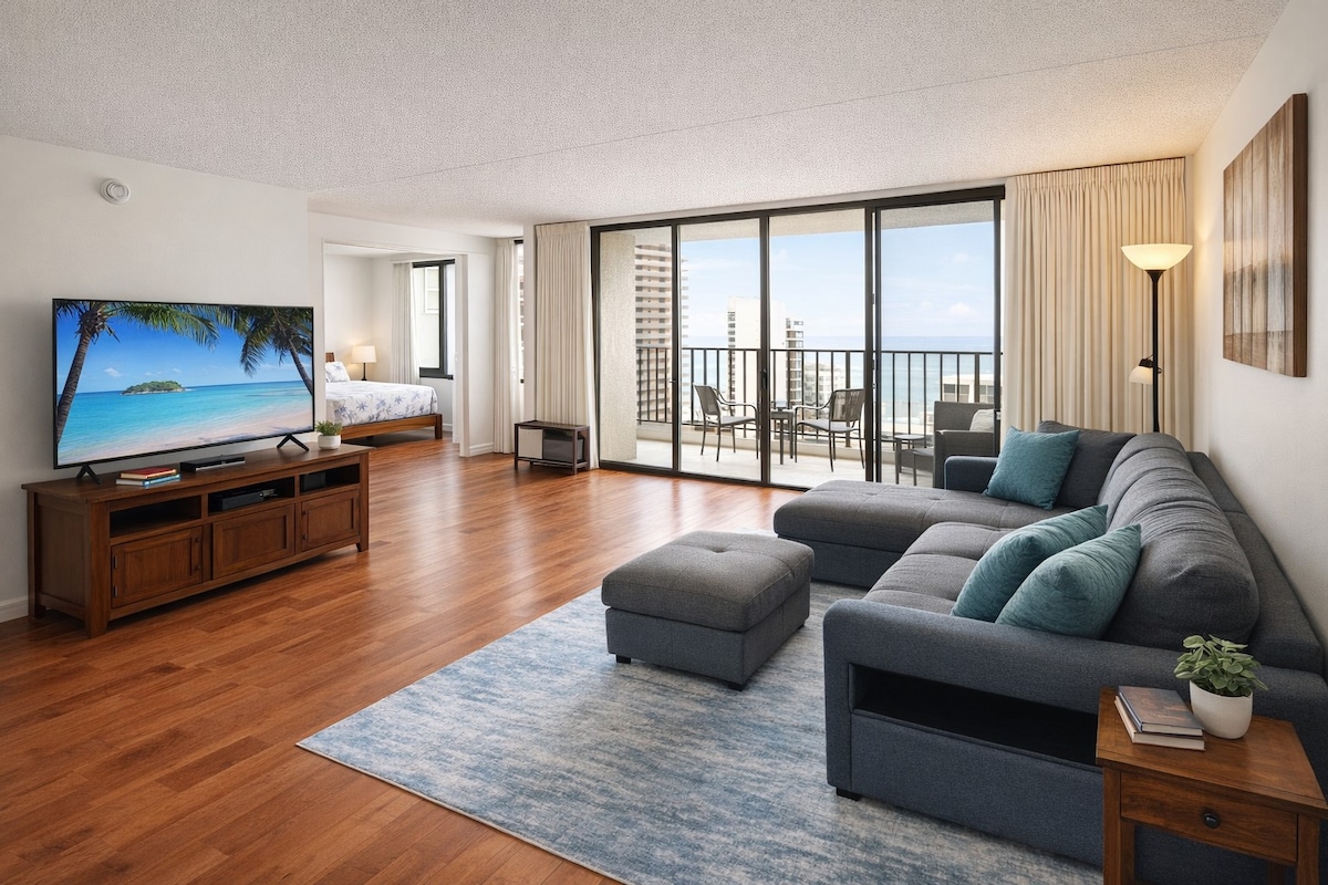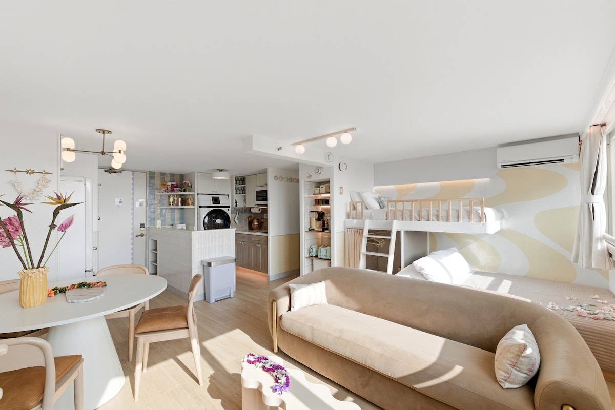 Book in the heart of Waikiki on a high floor with ocean views, a TWO MINUTE walk to the main beach & shops! Paradise is calling! Enjoy a cup of coffee while taking in the sweeping partial ocean, mountain, and city views. Our private and airy studio boasts a plush queen bed, firm twin sofa bed (recommended for a guest 5'9 or under), full bath & kitchenette. High-speed internet for streaming your favorite movies or catching up on remote work life. Reserve now before we're fully booked!