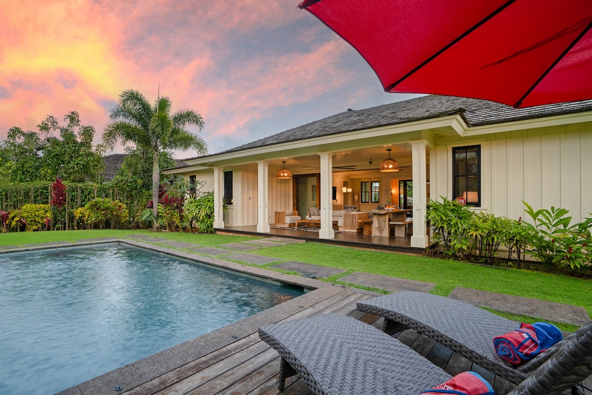 Escape to this private Hawaiian paradise, tucked away in a family friendly neighborhood minutes from Hanalei. Walking paths to shops, beaches, outdoor markets, cafes and grocery store are out the front door. Mornings on the lanai promise bird songs and tranquility as you sip your coffee or maybe you'll catch a few waves at Hanalei Bay before breakfast. Evenings dazzle here as you unwind and relax under twinkling cafe lights. You'll come for the beach but you'll stay for the rainbows.