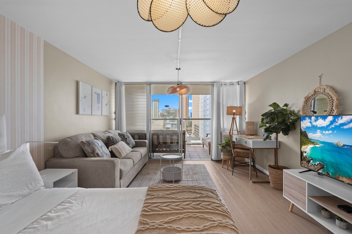 Fully newly remodeled in April this year! Everything is brand NEW! Amazing sweeping ocean view! Located on 33rd floor of Waikiki city, just a few minutes’ walk to the famous Waikiki Kahanamoku Beach & Lagoon, Ala Moana Beach Park, Ala Moana Shopping Mall, many restaurants , Cafes and Bars - everything is within walking distance. FREE PARKING is a Big Plus with a designated parking spot in the garage. You’ll have a great time in this brand new home with a queen bed and a sofa to stay!