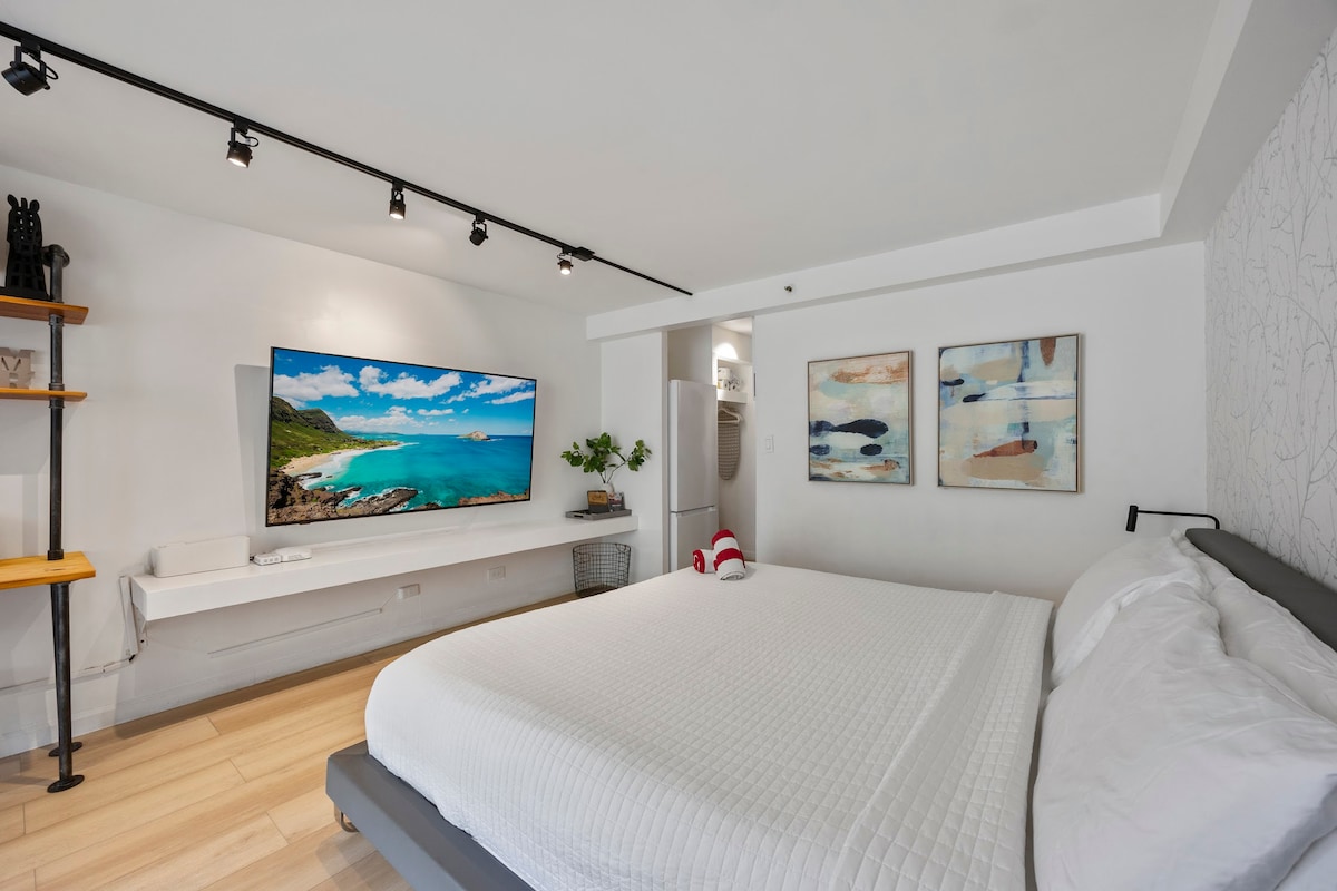 Aloha! Welcome to our modern renovated studio centrally located in Waikiki for the perfect getaway. Beautifully designed by a local Hawaiian designer. Enjoy breathtaking Waikiki sunsets over the twinkling city skyline. Hotel quality sheets, pillows, and air conditioning await you. Excellent location right across from the convention center, about a 10 minute walk to the beach, and a 15 minute walk to Ala Moana mall. Dine, swim, surf, and shop all within walking distance.