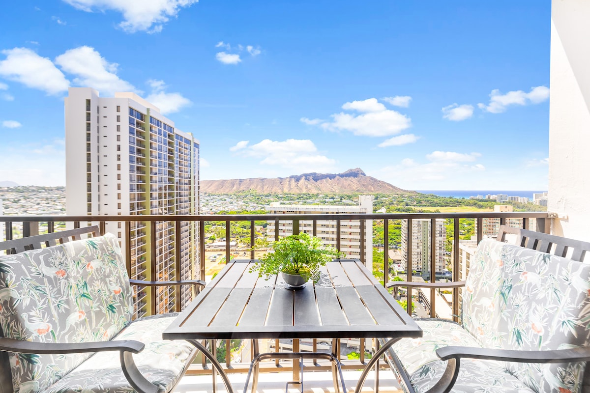 Aloha and welcome to our stunning newly renovated corner unit on the 43rd floor JUST below PENTHOUSE in the heart of Waikiki! The breathtaking views of vast Hawaiin Sea await for you as soon as you enter the unit. The balcony features gorgeous views of ocean, Diamond Head, city skyline and Ala Wai Canal. You can also enjoy beautiful sunset & Friday night firework from the lanai. This condo is fully furnished with modern designs, and perfect choice for family, couples or small group up to 6 ppl.