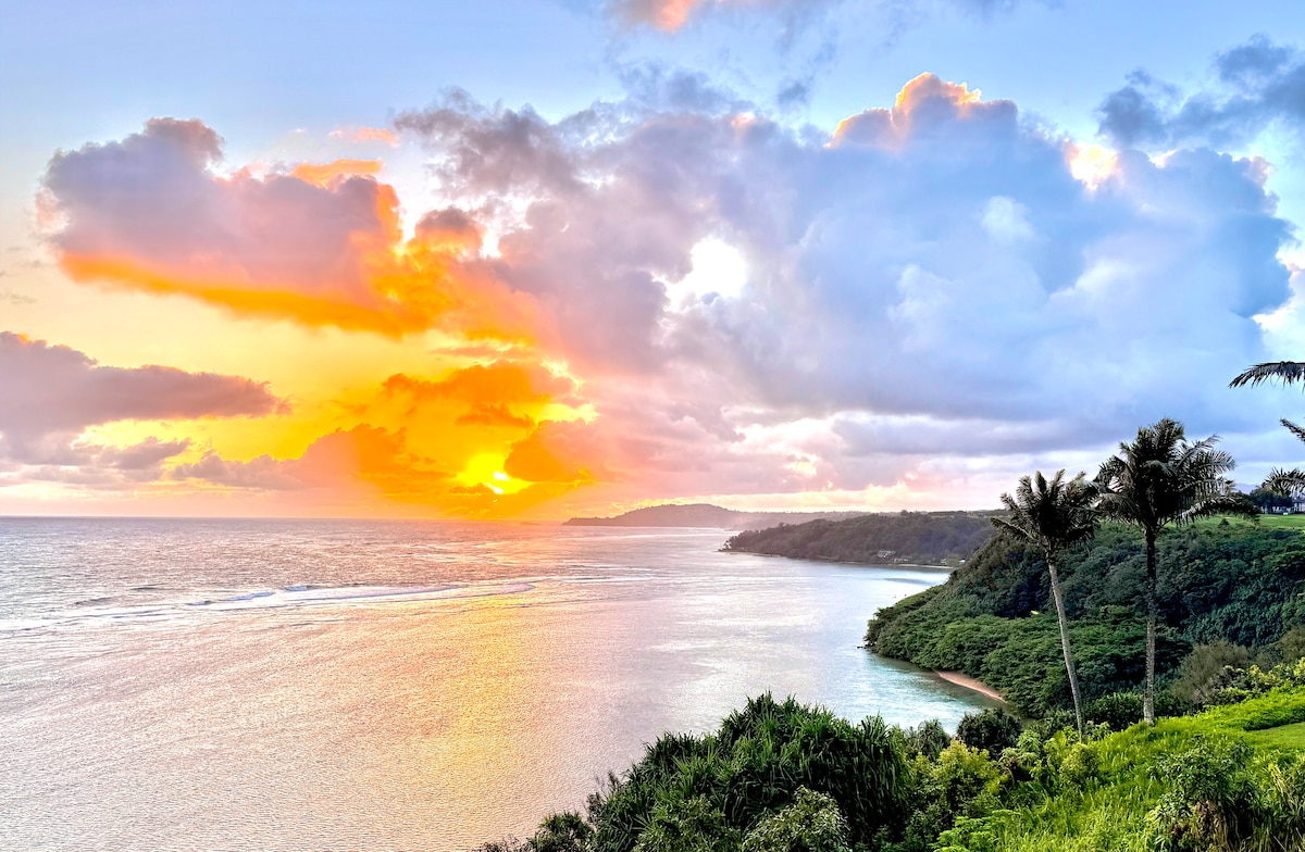 Perched on a dramatic ocean bluff, this stunning condo offers immersive panoramic views of ocean, reef, surf, and coastline from Princeville to Kilauea lighthouse. Experience the perfect blend of tranquility, luxury, and natural beauty. Newly remodeled in wabi sabi style of rustic natural beauty, this peaceful retreat is the perfect base for North shore adventures. Fully equipped kitchen. Both oceanfront sleeping areas offer queen beds and ensuite bathrooms. Private trail to Sealodge Beach.