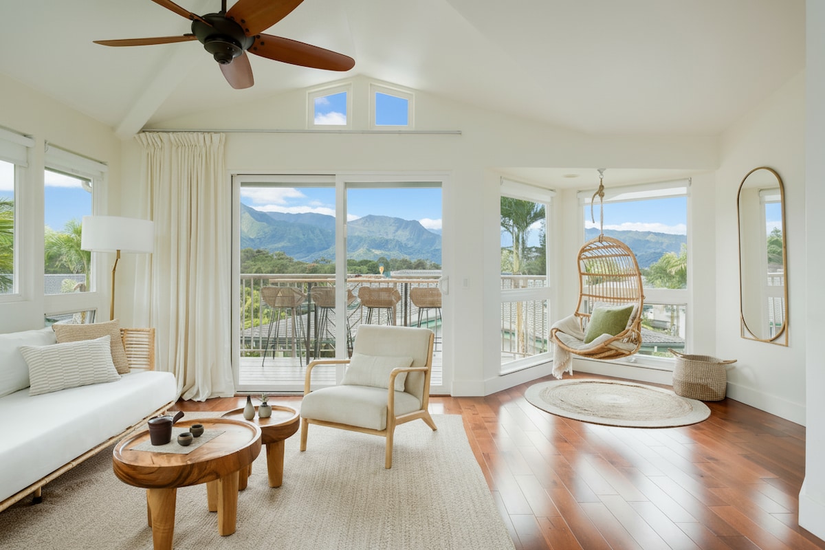On a bluff above Hanalei Bay, enjoy the beauty and peacefulness of Kauai's North Shore in this spacious and serene 4 bedroom / 4 bath home. With magnificent views of towering Kauai pine trees, a fresh & modern interior, full kitchen amenities, and the tranquility of a private residential neighborhood, Hale Maluhia (Peaceful Home) offers superb comfort and quiet retreat. And with easy access to many of Kauai's treasured wonders, you can adventure, explore, and enjoy your vacation to the fullest.
