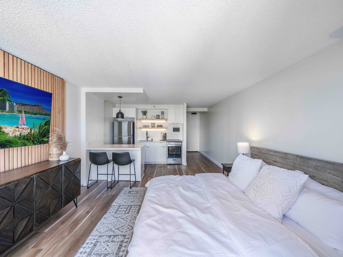 Renovated modern condo / studio centrally located in Waikiki, on the 8th floor of Marine Surf Waikiki Building with FREE PARKING on a private stall. The building is conveniently down the street from Luxury Row and the famous Royal Hawaiian Shopping Center and International Marketplace. Located on Seaside Avenue, a street perpendicular to the Kalākaua Avenue stretch— Waikiki beach, hotels, shopping, restaurants and cafes.