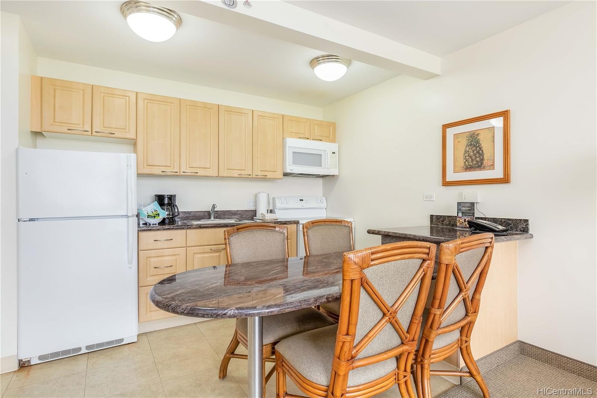 When you are looking for location, value and convenience to ensure the best possible vacation, this unit and building has it all. The one bedroom has a double bed and a twin bed. In the living room, we also have a sofa sleeper with a queen size mattress. One free parking spot comes with this rental. The kitchen is fully stocked and has everything you need to cook and feed up to 5 guests. You will appreciate the magnificent ocean and diamondhead mountain views from the comfort of central A/C.