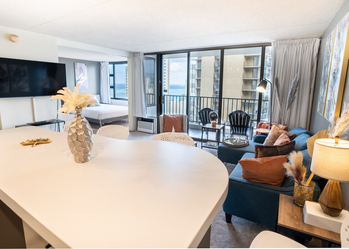 Experience the newly renovated corner unit at Waikiki Banyan, with stunning 270° views of the Koʻolau Mountains, Koko Head, Diamond Head, and the Honolulu skyline from a private 28th-floor lanai. Revel in breathtaking sunrises and vibrant rainbows. In the heart of Waikiki, the unit is just 1 block from Waikiki Beach, Kapiolani Park, and Honolulu Zoo. Walk Score 95, easy access to nearby grocery stores, coffee shops, restaurants, and shops. ★ "We can't wait to come back and stay here again!" ★