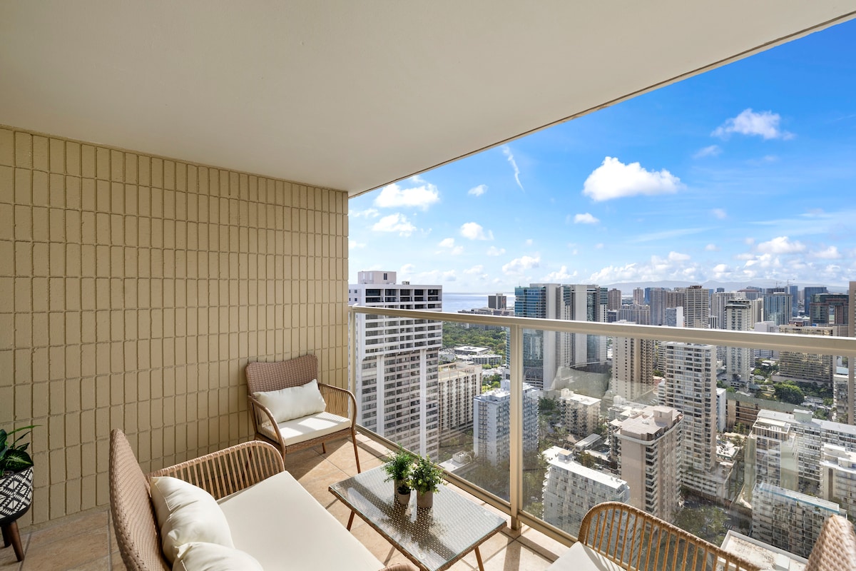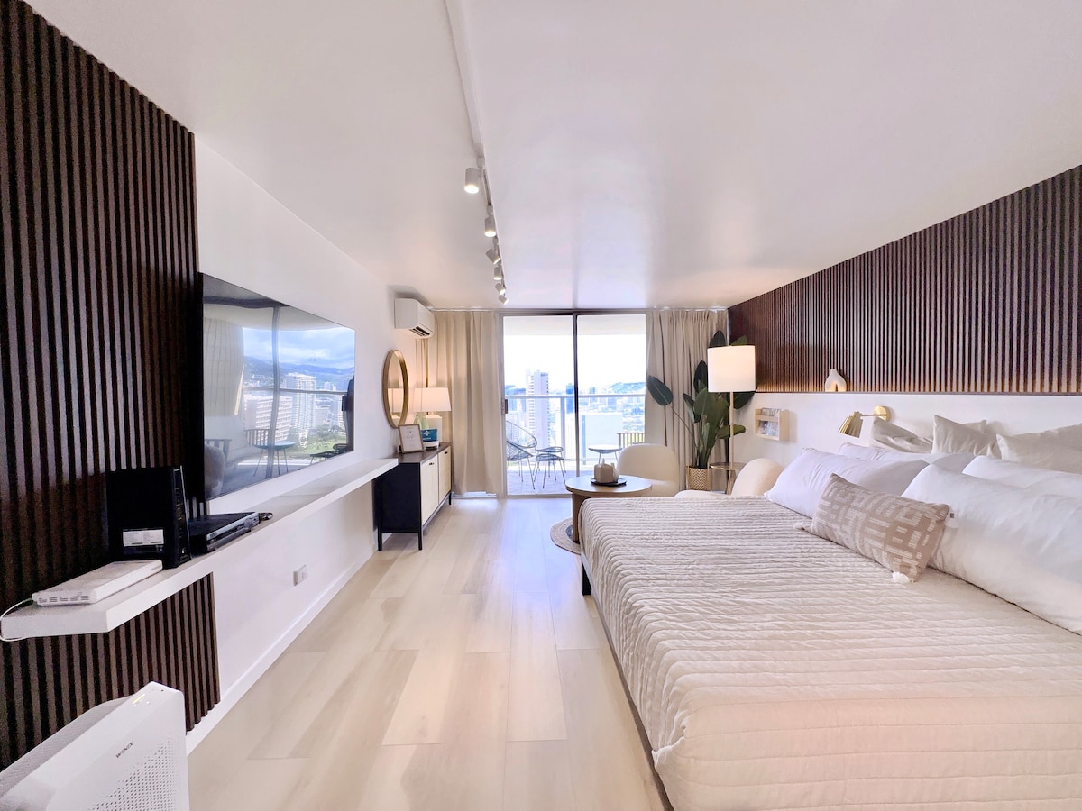 This is a high-floor studio unit on the 33rd floor. Enjoy phenomenal views of the vast Waikiki skyline and partial ocean views on your private balcony. Its location is in one of the most vibrant areas throughout Waikiki. It's very convenient to walk to attractions such as the International Market Place, Royal Hawaiian Center, and Waikiki Beach. This studio is furnished with a king size bed, and a twin sofa sleeper perfect for solo travelers, memorable occasions, and small families or groups.
