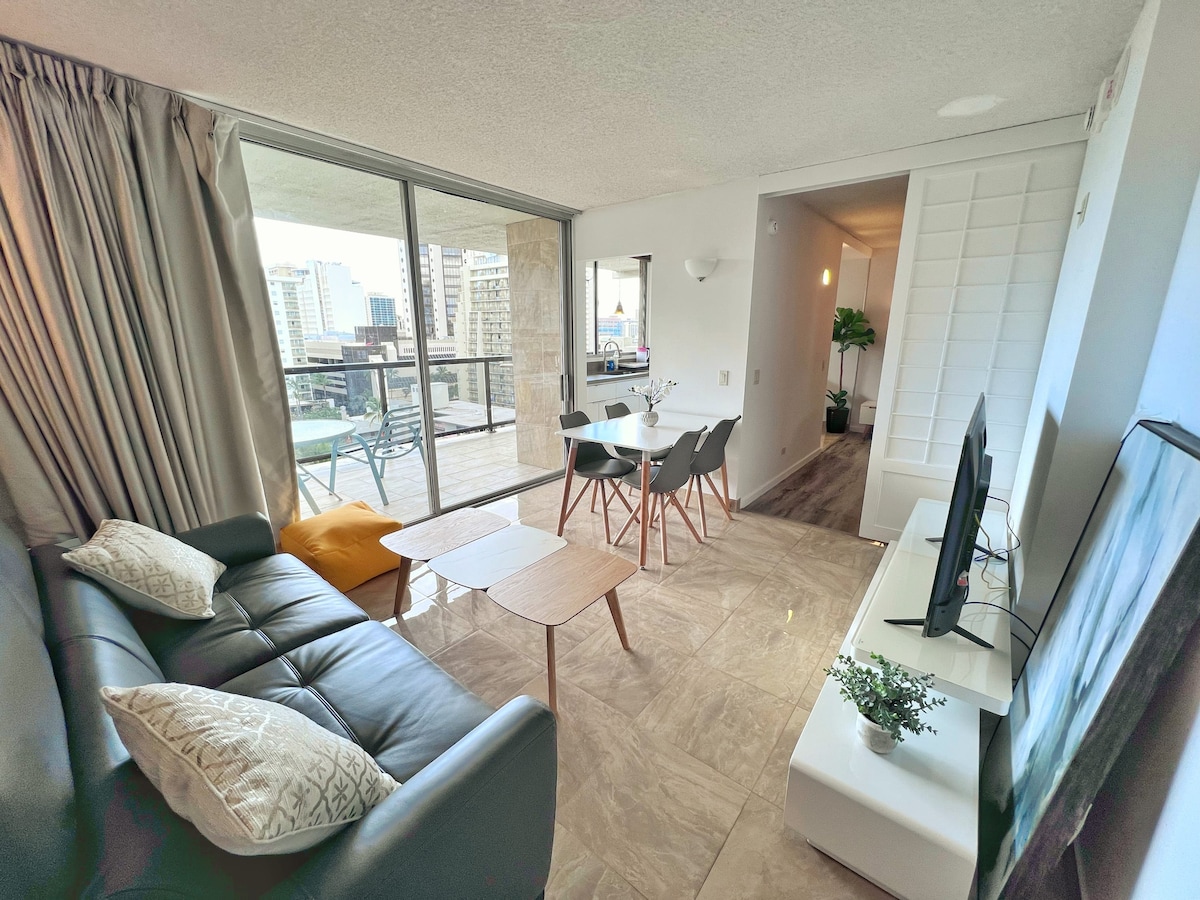 Stylish studio in the heart of Waikiki, with private lanai, spacious bedroom, fully equipped kitchenette, and premium access to Island Colony’s sun deck, pool, sauna, jet spa, BBQ, gym, and more!! Steps away from Kuhio Ave, with everything in walkable distance. Perfect for couple’s getaways, remote work, and family vacations! Under 7-minute walk to: ✔ Musubi & Bento IYASUME ✔ Marugame Udon ✔ Waikiki Beach ✔ Royal Hawaiian Center ✔ International Market Place