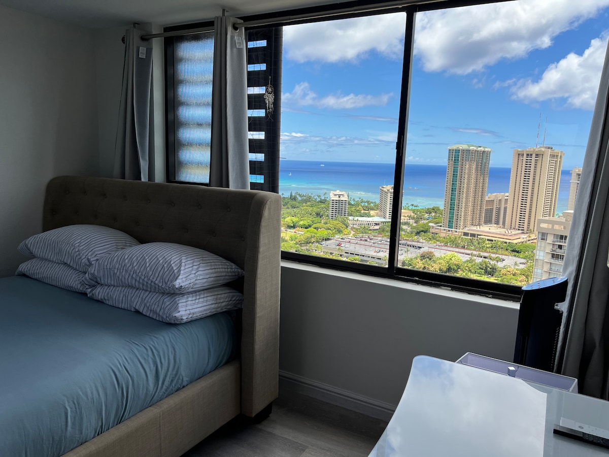 * Aloha! Welcome to our happy place in the heart of Waikiki! * If you are looking for stunning ocean views directly from your bed, this is it! You are within minutes of walking distance to almost everything - beaches, restaurants, bars, surfing lessons, boat tours, grocery stores, shopping malls, and more. Our spacious bedroom, full kitchen, and freshly updated bathroom will make you feel just like home. Welcome to our little paradise!