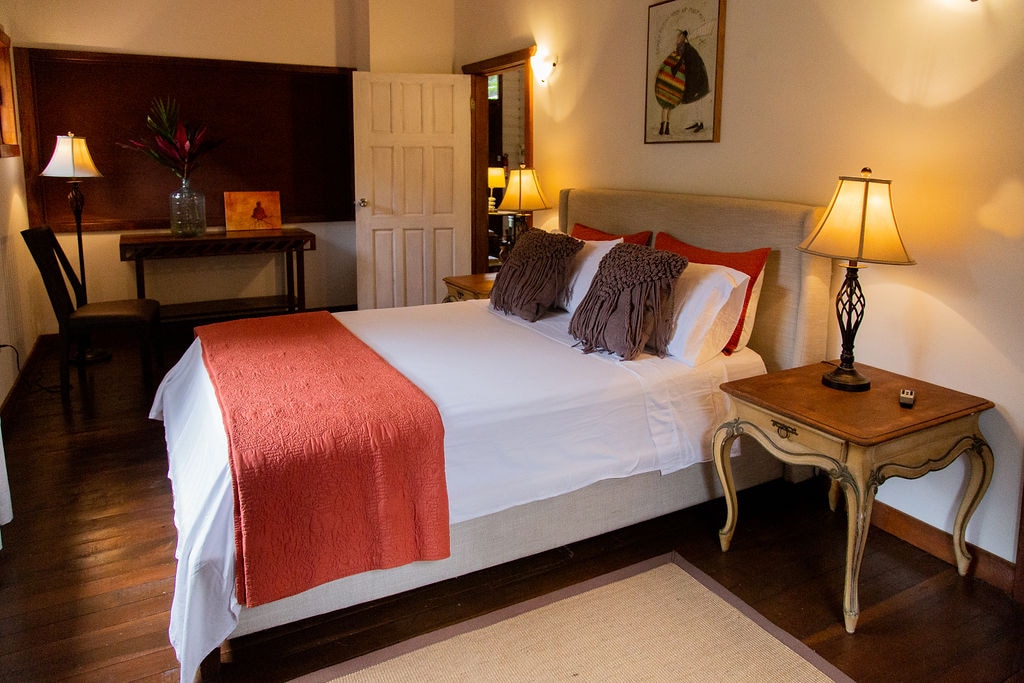 Clean, comfortable and colorful; the suite is in a classic wooden home, view of sea. Mosquito nets queen sized bed, dinning area, private bathroom hot shower, futon couch Fans. The room is divided by a one of a kind driftwood art piece, the suite entrance and porch has its own hammock. Great view and breeze of the sea. The owner is an artist and chef who offers family style dinners every day as well as other meals through out the day upon request. We have free bikes, kayaki, catamaran rentals