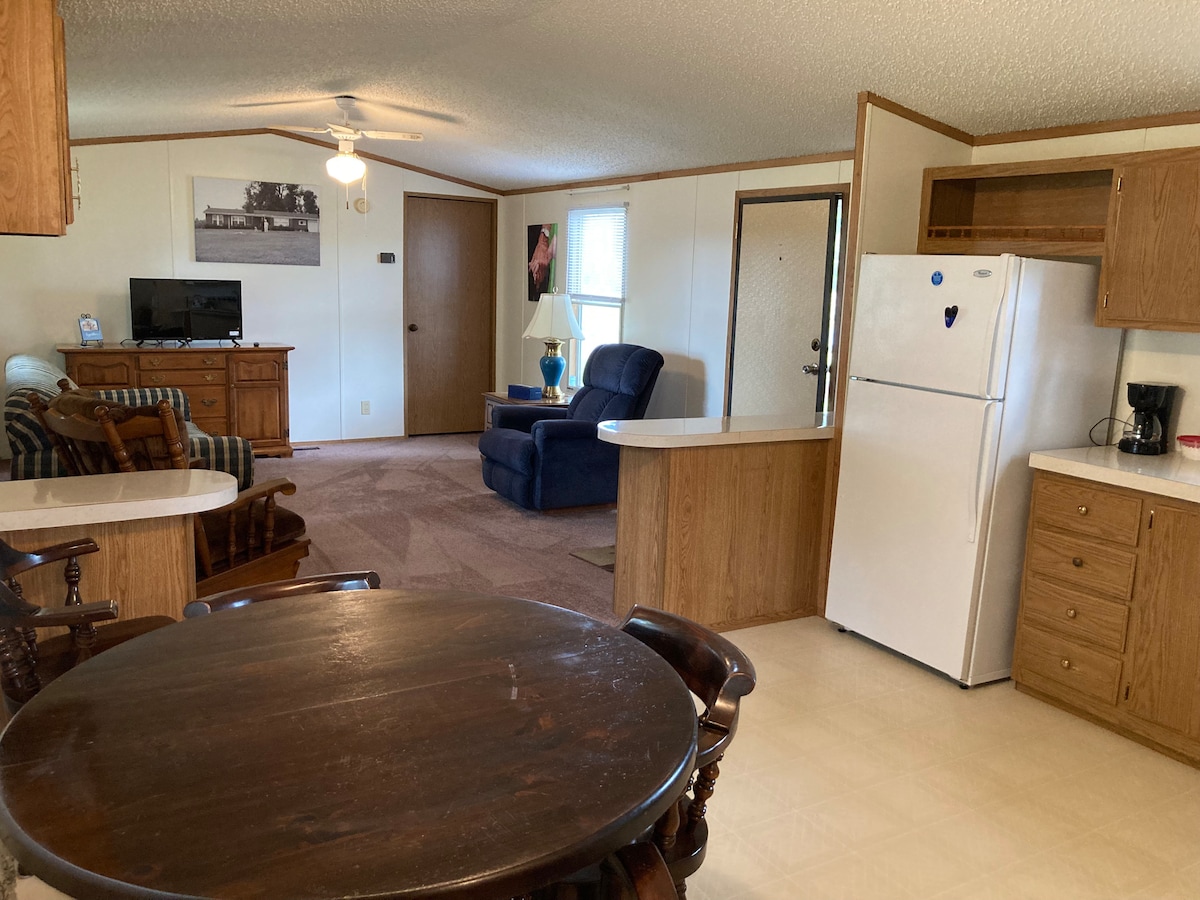 This home 🏡 offers a tranquil place next to the city park and view of lake. Home offers 2 large bedrooms both with king size beds. Each bedroom has their own heating and air with ozone cleaning to assist in the cleanest air we can provide. The living room offers a new queen sleeper sofa. Our kitchen is stocked many cooking appliances and pantry items but no stove or oven. Upon request we provide bikes, games, grills, memory foam top for sofa bed and most anything you need for infants/toddlers.