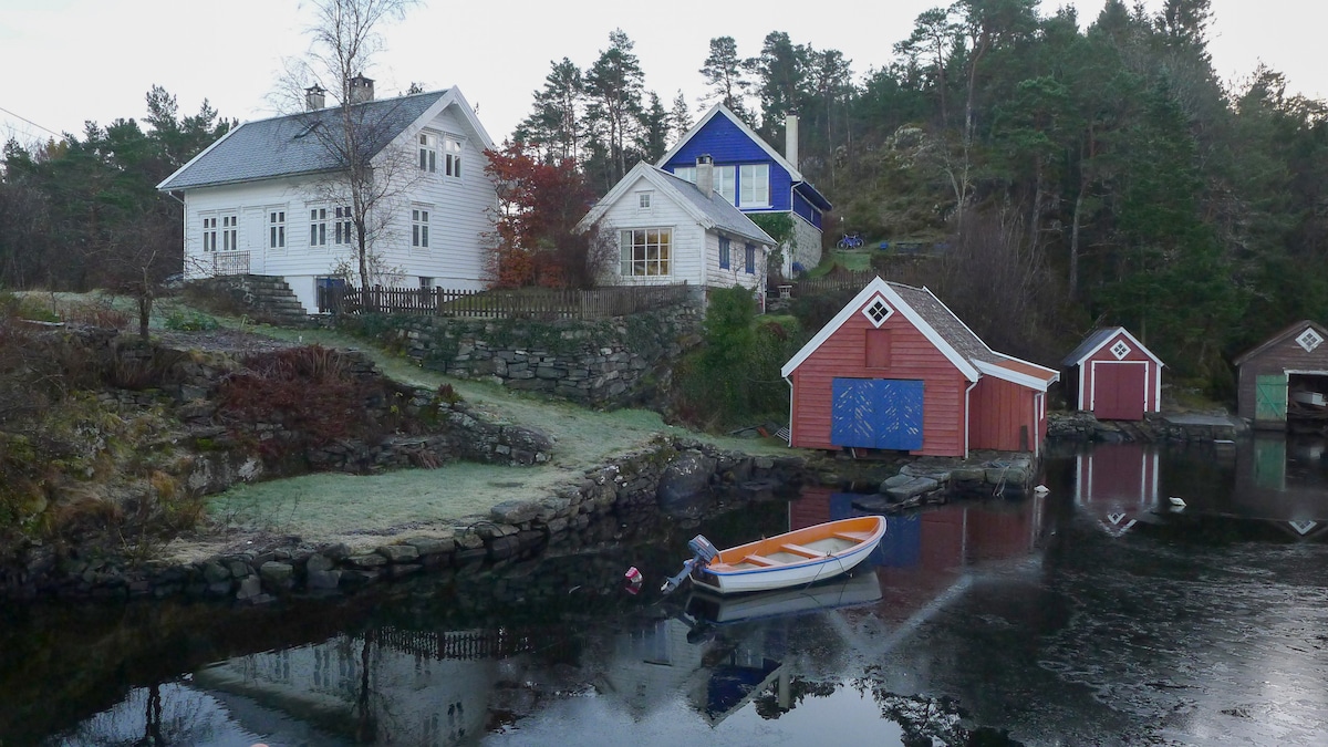 Enjoy the spacious Icehouse and the calming view over Hanevik bay on Askøy - 35 mins outside Bergen by car (65 min by bus). Relax and gain energy to explore Bergen, the fjords and the beautiful west-coast of Norway or to attend your business in the area. The Icehouse is part of a "tun", a private yard surrounded by five houses.
