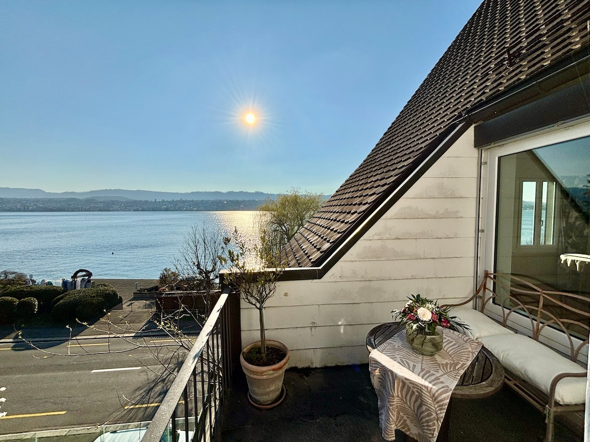 Das neu renovierte Haus liegt direkt am rechten Zürichseeufer, welches auch Goldküste genannt wird. Wir vermieten das schmucke Dachgeschoss im 3. Stock mit atemberaubender Aussicht nur an wenige, handverlesene und erfahrene Gäste. Es handelt sich um ein neues Studio mit kleinem WC/Dusche und einer modernen Küche mit kleiner Bar, einer Essens-Ecke mit antikem Schiefertisch, einer Leseliege und einem grosszügigem Doppelbett mit antiken Balken.