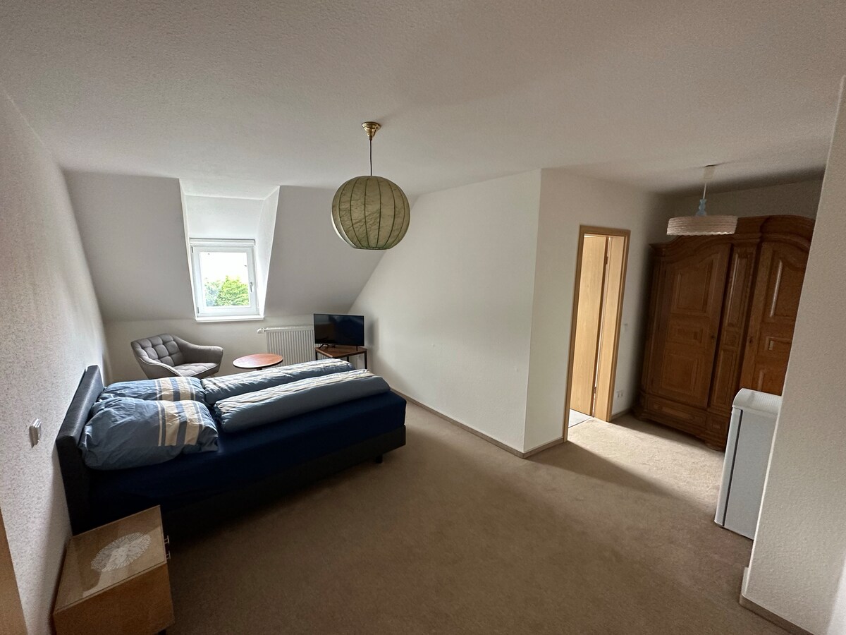 Carpe Diem..genieße den Tag Wohnen bei Freunden..unter diesem Motto werden wir euch herzlich empfangen. Fühlt euch wohl in unserer abgeschlossenen DG Wohnung, von hier aus könnt ihr tolle Touren starten, egal, ob zu Fuß, mit dem Rad oder Motorrad. Es gibt viele Kilometer ausgeschriebene Motorrad/Rad/Wanderwege.Nach einem aktiven Tag laden der Balkon oder der Garten zum ausruhen oder grillen ein. Wir freuen uns auf euch und wünschen eine erholsame Zeit bei uns mit tollen Momenten,bis bald :)