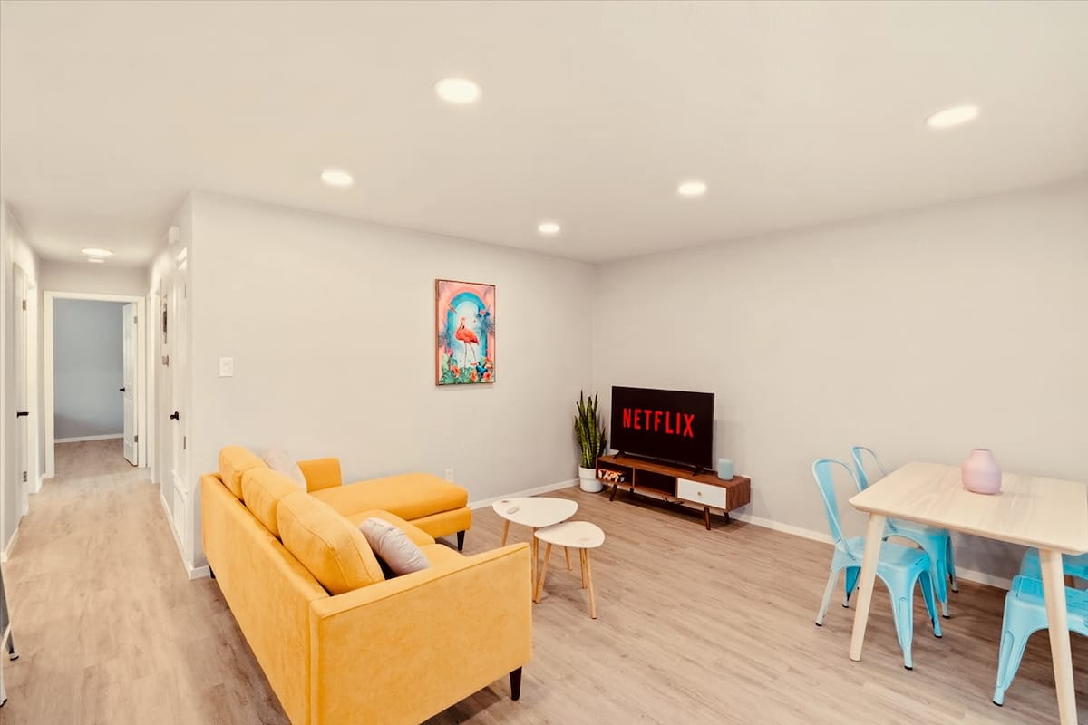 Dreamy casita vibes in this unique, high ceiling space. Tiny but spacious enough to not feel cramped. You would have all of the space inside the casita located in the backyard of the front house with a fully enclosed deck space with patio furniture to enjoy breakfast and coffee outside. Everything you need & more for amenities all in one special package. We are absolutely positive you will feel the love that we put into this casita and can assure you will fall in love with it just like we have.