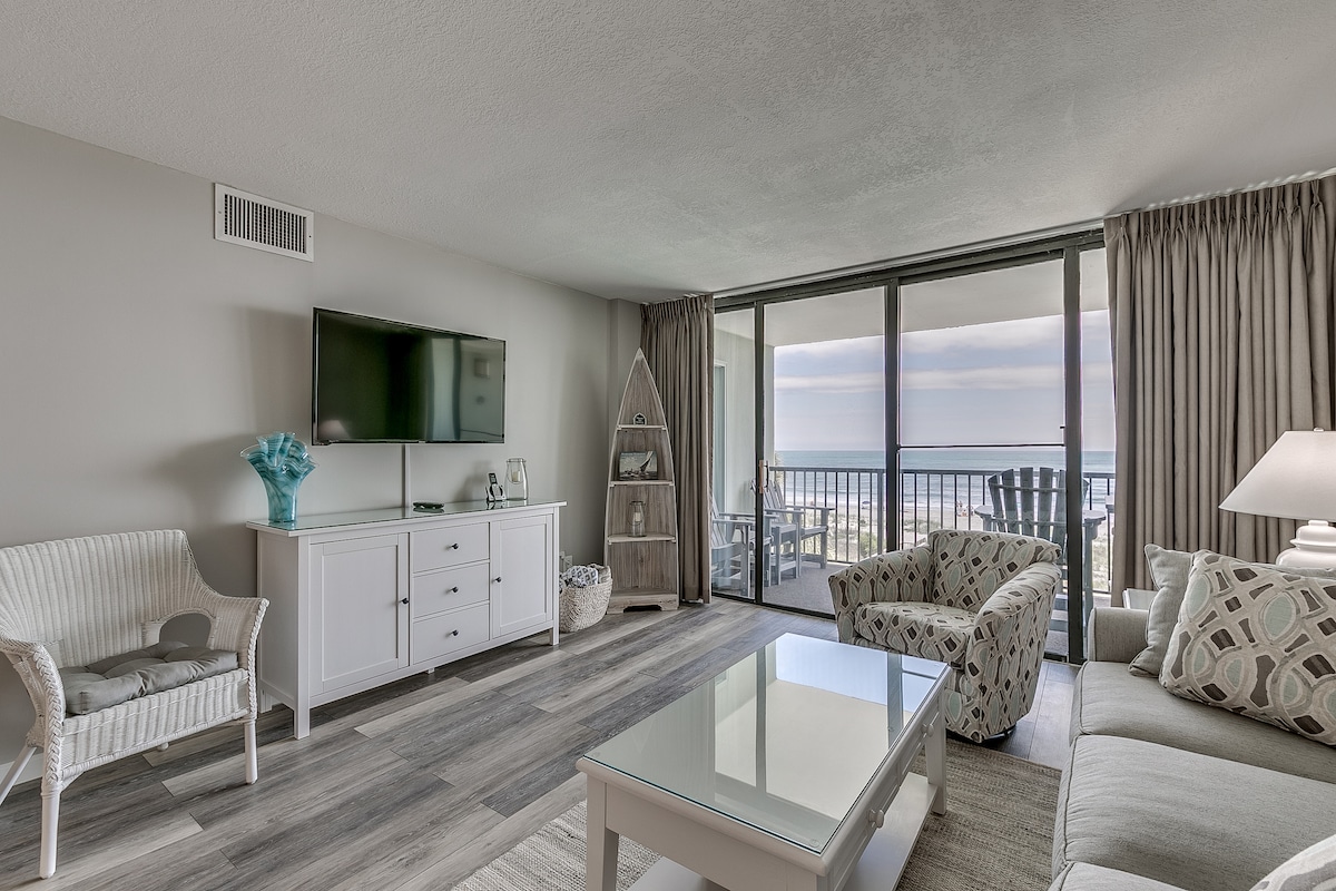 Gorgeous, breezy 9th floor ocean view condo! Located in a peaceful area directly across the street from the beach. Sit on the private balcony and watch the sunrise, and spot dolphins playing in the afternoon. One bedroom and comfy sofa bed can sleep 4. 6.8mi from the MB International Airport (MYR). Less than 4mi from Boardwalk at the Beach and many other attractions, restaurants and shops.