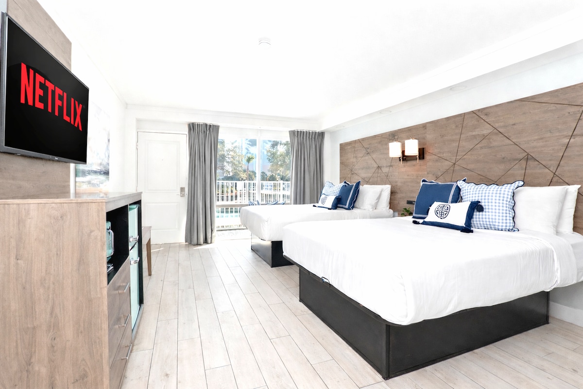 Just steps from the sand, our newly refreshed 1BR suite at Fin’s Inn & Suites is perfect for families and small groups seeking sun, space, and simplicity. With two plush queen beds, a sleeper sofa, a full kitchen, fast Wi-Fi, and AC, there’s room to relax and reconnect. Kids love the game lounge and outdoor pool, while grown-ups appreciate the walkable access to the beach, Boardwalk, dining, and attractions. A breezy, fun-filled escape made for memories.