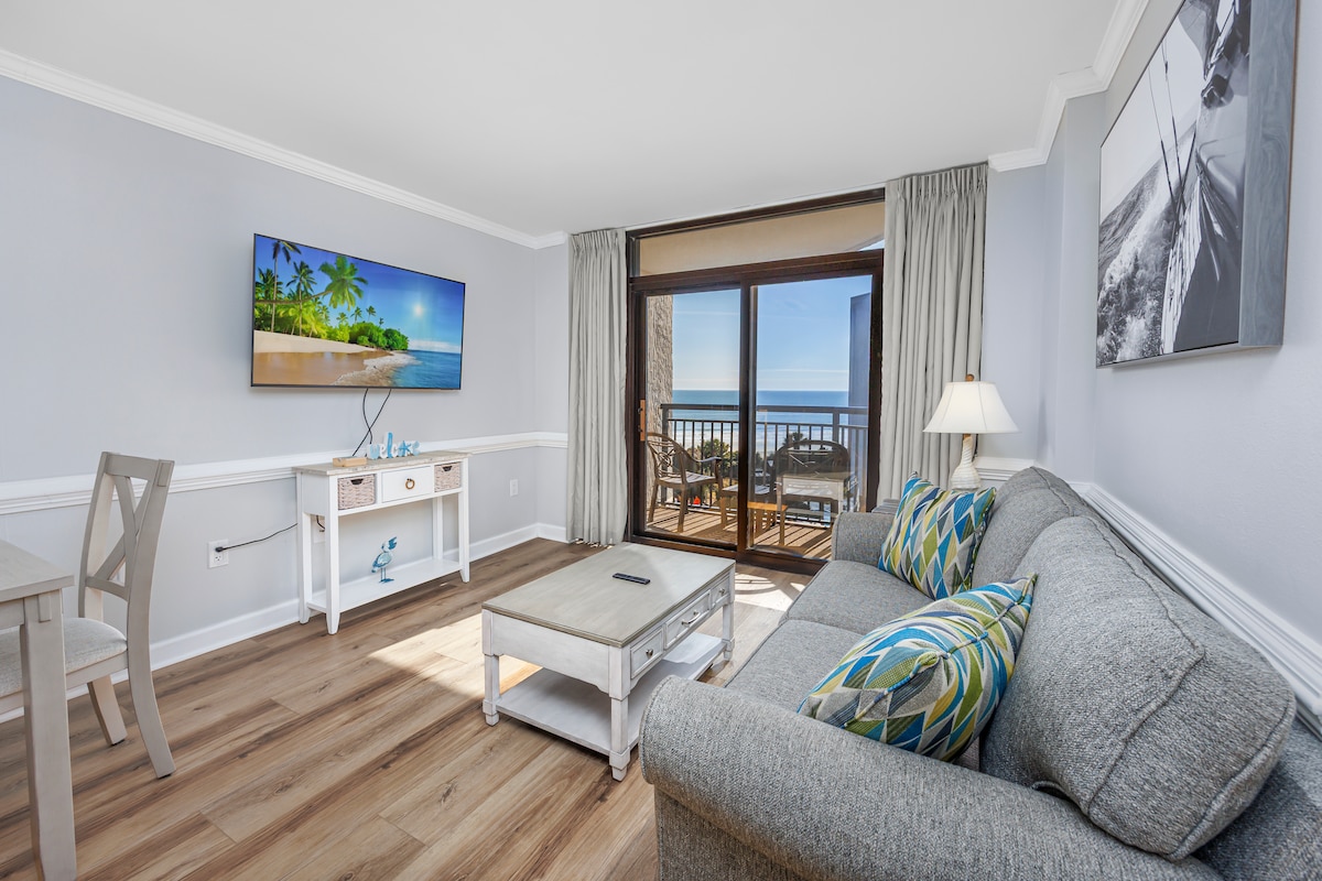 Lil' Salty is a remodeled oceanfront 1-bedroom condo (sleeps 4) at the pet-friendly Patricia Grand Resort. Enjoy resort amenities like heated pools, 4 hot tubs, a lazy river, and direct beach access. New mattress, sofa, and more added in Spring ‘24. Free parking for 2 vehicles. Just minutes from attractions, golf, and the airport. Enjoy amazing ocean views, plus a clean, updated space with extra touches like beach gear and pet-friendly amenities. Perfect for family fun or a romantic getaway.