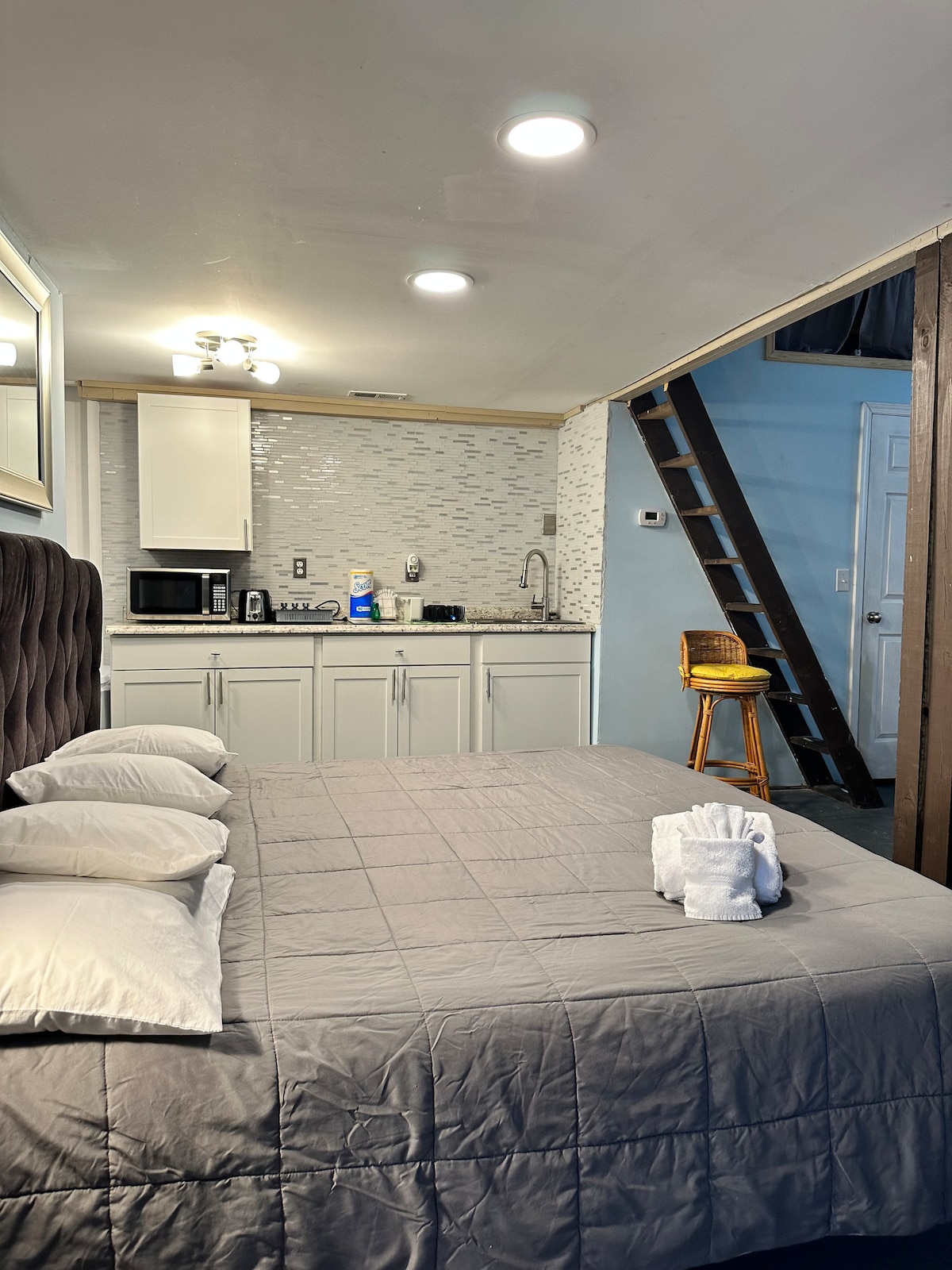 This unique guest quarters features a kitchenette, king bed, sofa, tv, pool table, and an upstairs loft. You’ll be close to everything! Walk to the beach, local restaurants, playground, and library. It’s just a 2-minute walk to tennis courts, the library, and farmers market, and only minutes more to the ocean and dining spots. A short drive takes you to Murrells Inlet and all five nearby hospitals. Perfect for long-term beach stays or travel nurses.