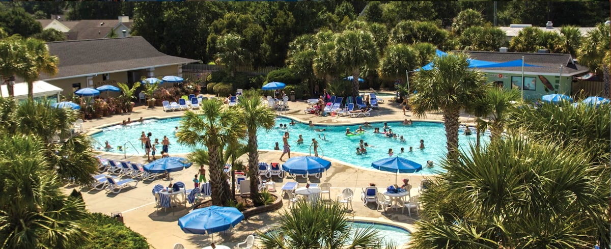 The water awaits! Pool view and beach across the street! Ground floor efficiency condo, complete with comfy beds, walk-in shower, easy access to the courtyard, parking, seasonal pools, and lazy river! Enjoy coffee on the patio and see the teal tides through the palm trees! Five minutes from the Boardwalk, Strip, and airport, and walking distance to TONS of restaurants, shops, and attractions! Calming coastal design - Teal Tides is a hidden gem, right along Myrtle Beach's coastline! 🌴🌊