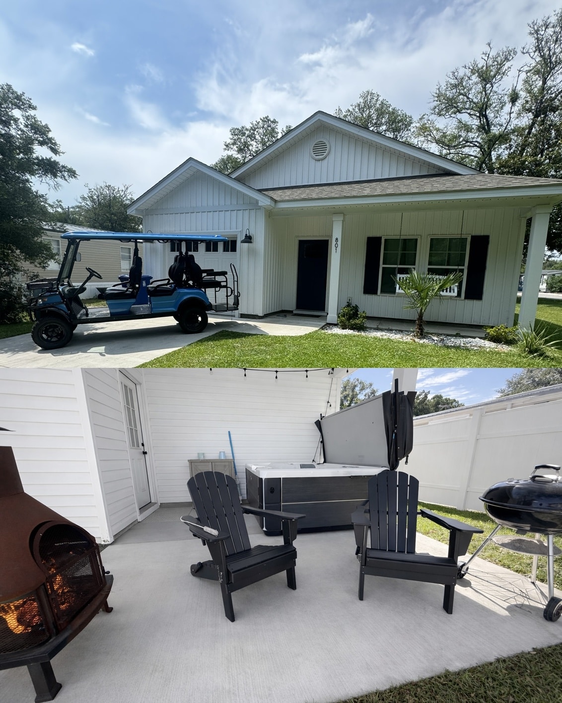 This centrally-located, dog-friendly, single-level home will have you creating perfect days in no time! Newly remodeled in 2022. Less than 2 miles to the beach, minutes away from restaurants, and several golf courses within reach! Inside you will find hardwood floors, an open living/kitchen area with plenty of room to gather, and a charming adjacent room that includes a table that seats six. TVs in every room with streaming, and Serta mattresses to ensure a blissful nights sleep!