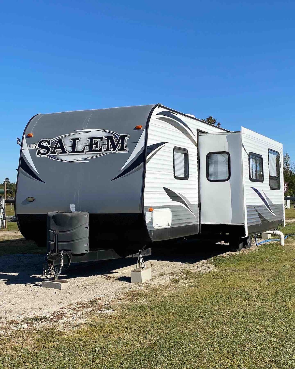 WE DO NOT RENT THIS AT OUR RESIDENCE. You must have a site already rented at one of the local Campgrounds. Get cozy in this perfect family RV with space for guests. The living space has a dinette that faces your camp site instead of your neighbors with a large window. The living space includes a queen bed and two double bunks that are rated for up to 300lbs each. The dinette and the sofa provide for two more sleeping areas. The kitchen is fully stocked with a large refrigerator and airfryer etc