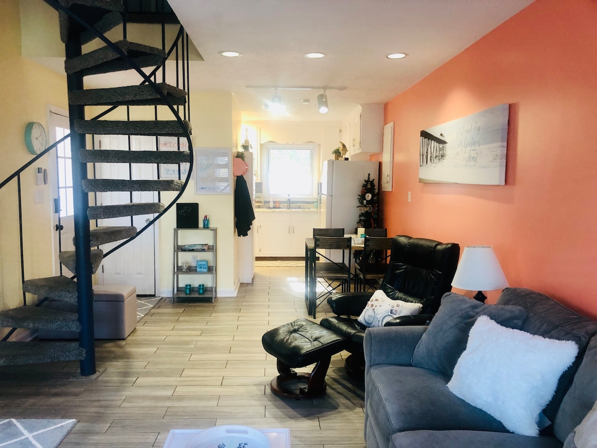 Beautiful townhouse located in a quiet community. Kitchen is fully equipped with everything that you need to make all meals. 1st floor is spacious with a kitchen/living room area equipped with a washer/dryer, TV & powder room. Q size air mattress and a nice cozy L shape couch. Up the spiral staircase to a nice K size bed, bunk beds, full size bathroom and TV. Private fenced patio with chairs for entertaining. Cable TV/smart - $50 PET FEE EXTRA Whole yard fenced enter gate to front door
