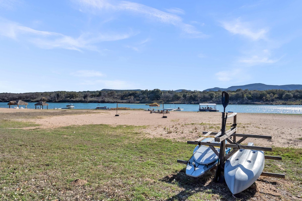 Discover this expansive 5BR lakefront oasis at Buchanan Dam featuring your own sandy shore and courts for basketball and volleyball. Perfect for groups up to 25 seeking an active yet peaceful getaway. Stay connected with WiFi and Dish Network while making unforgettable moments. Don't forget to save this unique retreat by clicking the heart button!