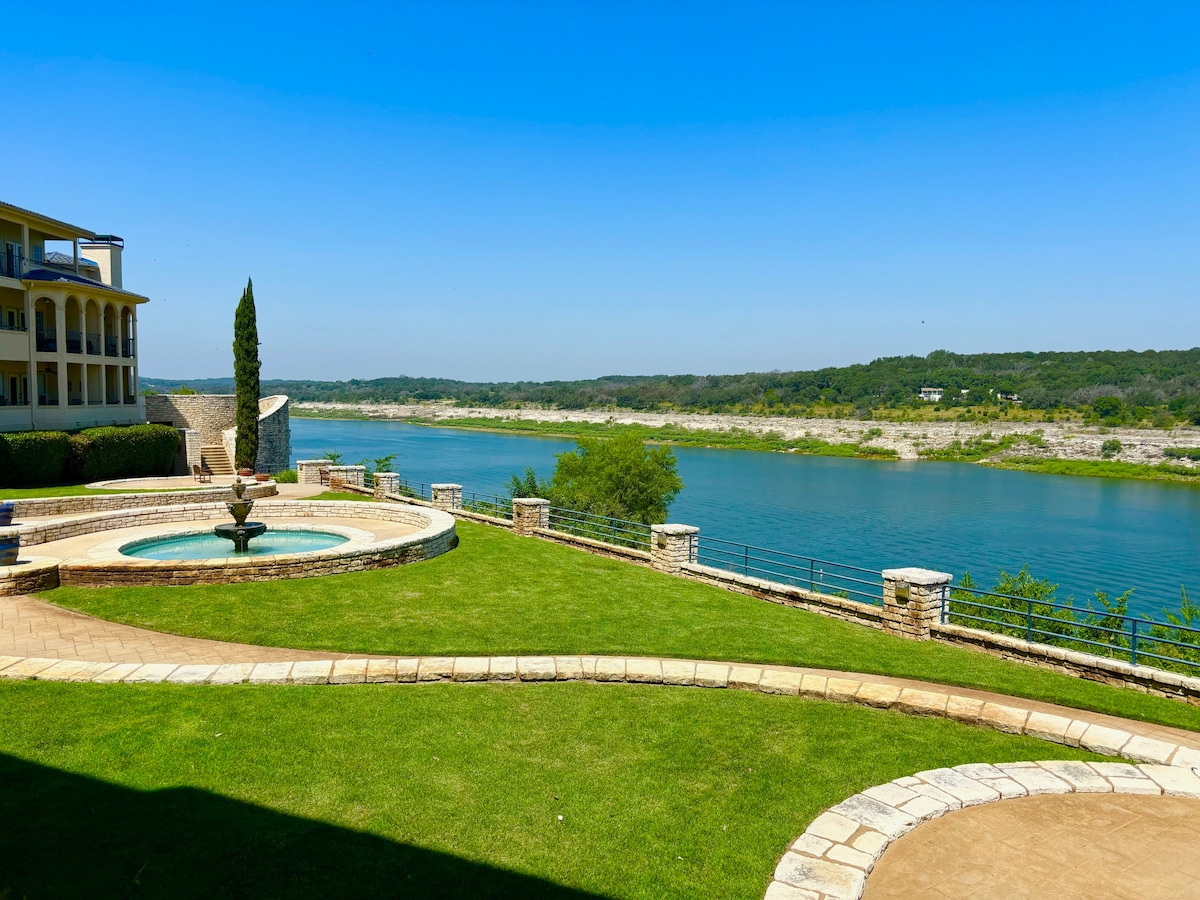 Waterfront top floor villa with deep water views from patio, living room and bedroom. Boat slip available (extra charge) Daily deer encounters and watch sunsets on Lake Travis' private island. WiFi, elevator access, washer dryer, weekend salon/spa, restaurant and three pools, hot tubs, saunas, fitness center, shuffleboard, pickleball & tennis. Maximum 4 guests, including infants and children. Must be 21+ to book. More villas available for family & friends. Nice people only 😊