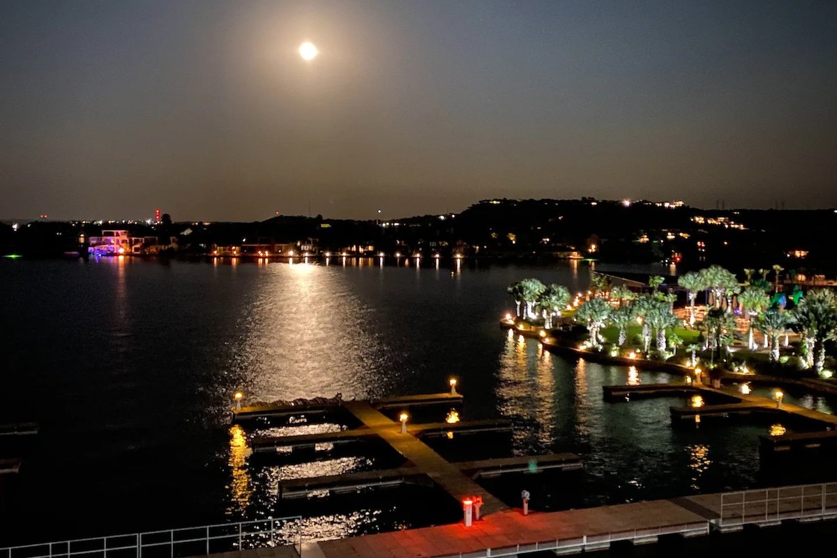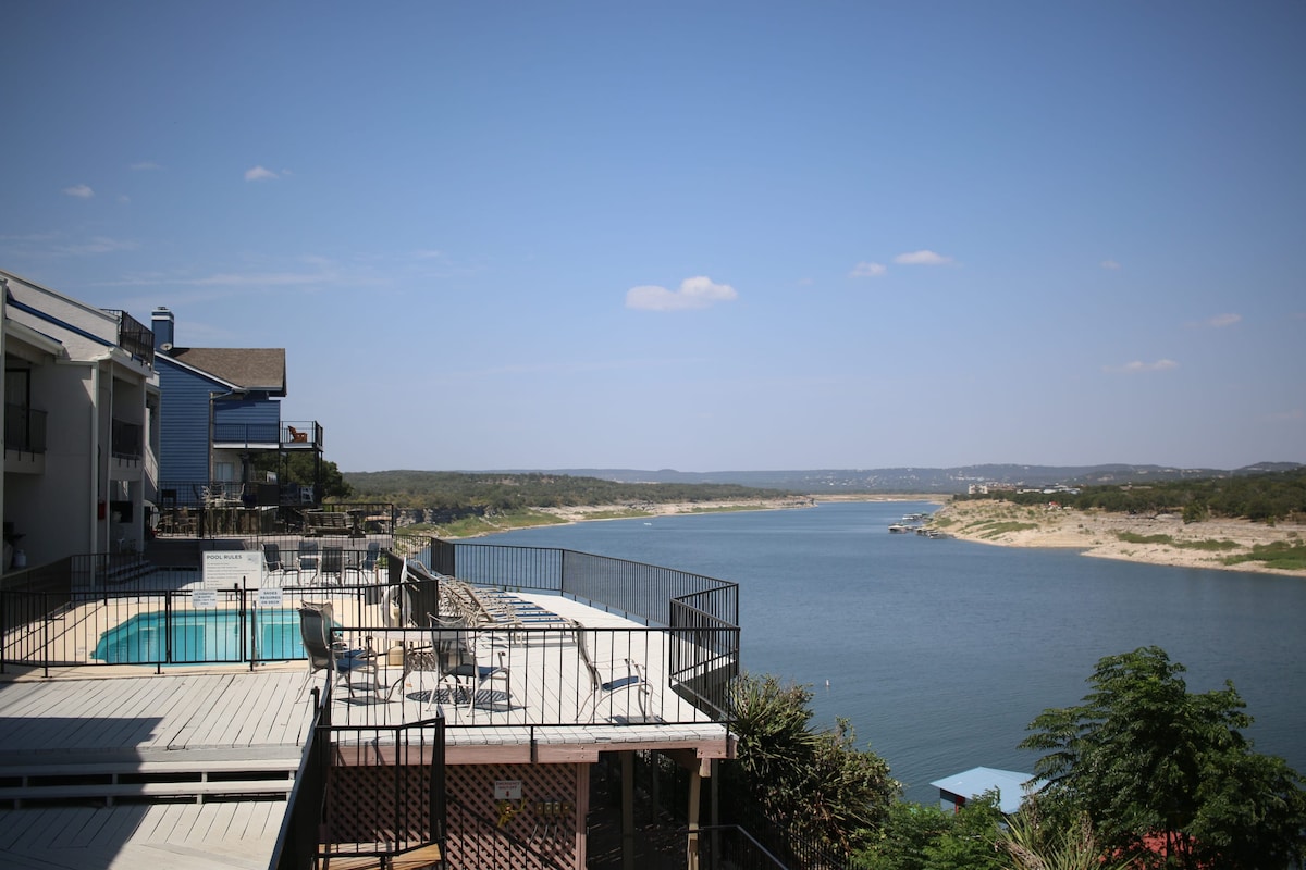 Waterfront top floor villa with deep water views from large patio, living room and bedroom. Boat slip available (extra charge) Daily deer encounters. Watch sunsets on Lake Travis' private island. Stand up shower, jacuzzi tub, washer/dryer, weekend salon/spa, restaurant, 3 pools, hot tubs, saunas, elevator access, fitness center, shuffleboard, WiFi, pickleball and tennis. Max 4 guests, including infants and children. 21+ to book. More villas available for family. Nice people only! 😊