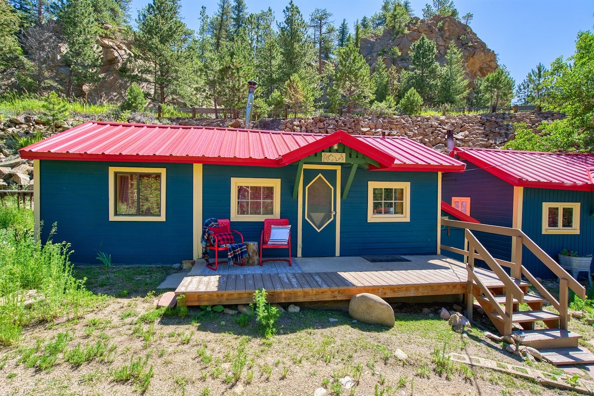 Nestled in the outskirts of Lyons, Colorado, just 11 miles from Rocky Mountain National Park (6 miles southeast of Allenspark), the Riverside Cabin combines the charm of a classic rustic log cabin with modern mid-century upgrades. You can admire the picturesque Colorado sunsets from the swing on the wrap-around deck, the hot tub, or through the floor-to-ceiling windows in the living room, which offer stunning views of the Saint Vrain Creek and wooded mountainside.