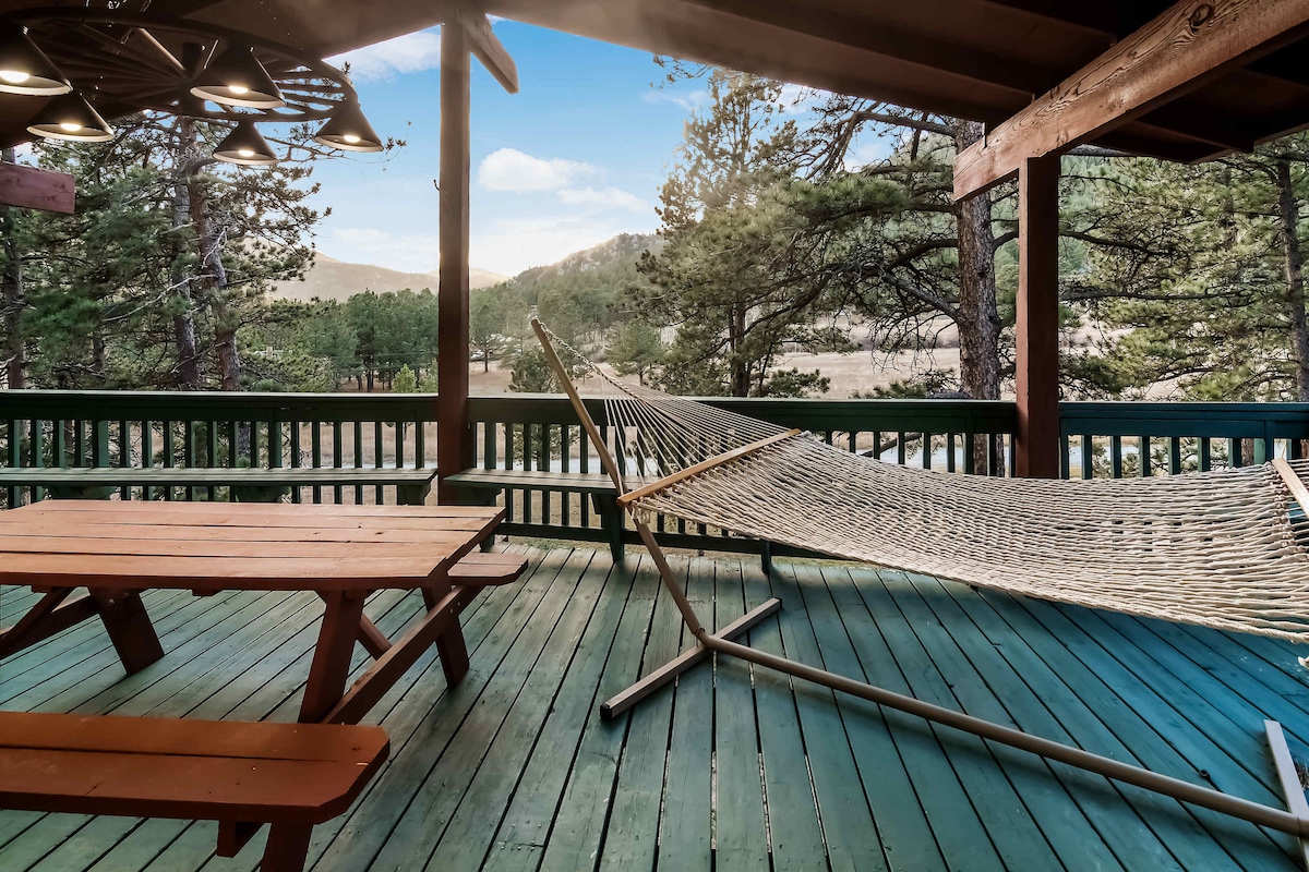 A perfect couples retreat! Hike into Rocky Mountain National Park from the front door, soak in a private hot tub, enjoy a wood stove, charge your car & stargaze beneath a skylight from a luxe king bed (21-ZONE3143). "By far the best Airbnb we have stayed at" - Allison A block from the park boundary (elk & deer abound) & 5 mins to town. + Eco-friendly AC & heat + EV charger + Wood stove + Beetle kill woodwork + Big kitchen, laundry + Mood lights + Walk in shower Zen studio for 2, circa 2023