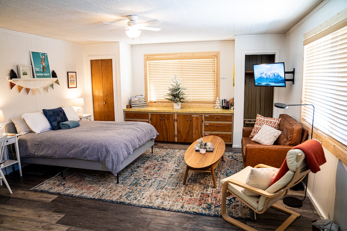 Spacious, clean studio with private entrance, kitchenette, queen bed, living area, YARD! NEW large windows, laminate flooring, rug, loveseat (#3265). Up to 1 gig wifi for remote work and streaming. Trex deck (w/ large awning in summer), hammock, electric grill and picnic table. Mule deer and birds often in yard (elk at times). Convenient- walk 1 block to Event Center festivals, 2 blocks to Lake Estes, w/in 1 mile breweries, restaurants, downtown and Visitor Center shuttle. Superhosts since 2014.