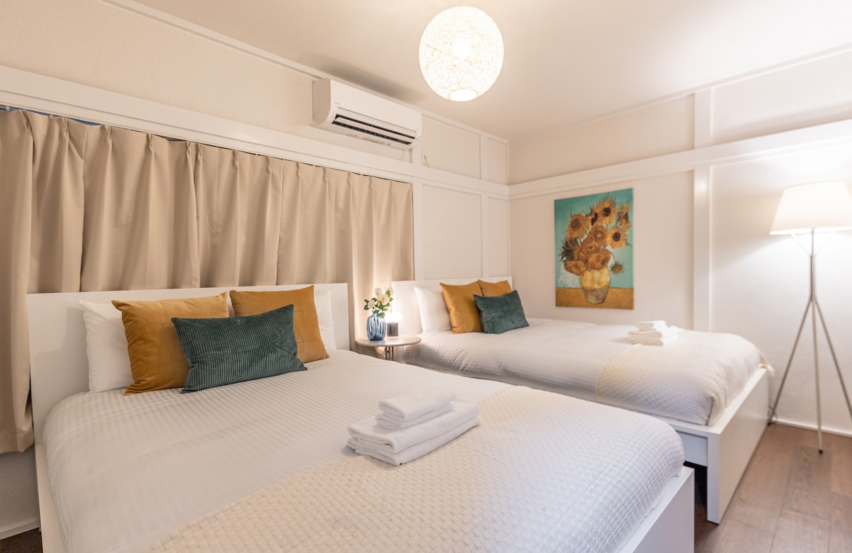 紧邻阪堺电车的帝塚山四丁目站,天王寺只需15分钟的电车车程. 前往难波则需20分钟,交通便利。 步行5分钟即可到达南海电车的帝塚山站,前往机场也很方便。 -最大入住人数:4人 -提供2张单人床和2套榻榻米 -传统日本美学与现代风格和谐结合的舒适空间 -房间内配备了女性喜爱的护肤用品。 -1楼的入口区配有带洗衣粉的洗衣机,2楼的客人可以共享使用,适合长期入住。 *不能做饭, *提供了迷你厨房,您可以享用自带食物或外卖。 周边景点: 周边有丰富的日本文化和历史,像住吉大社和以刃物闻名的堺,交通便利。 提前入住: 请提前咨询 入住时长: 可接受短期和长期住宿 特别体验: 在邻近建筑的酒吧里,与当地人互动。