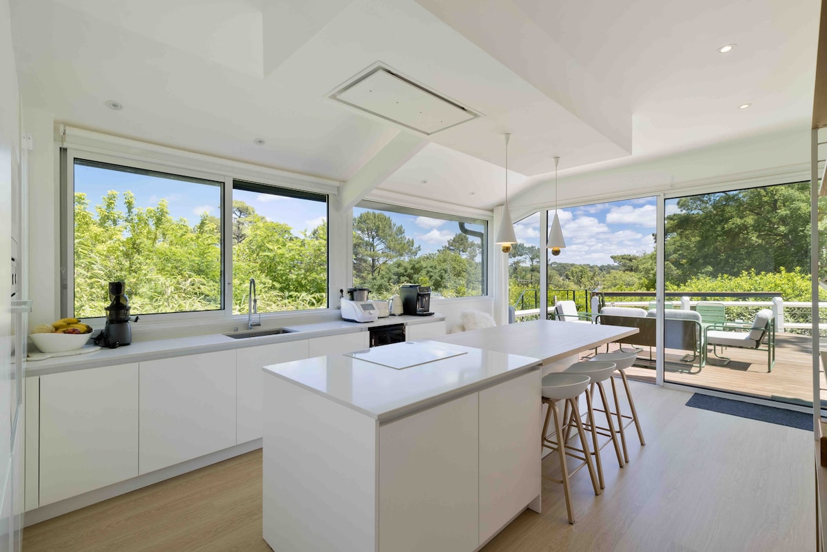 Between ocean and forest: welcome to Villa Leontine. An exceptional location, peaceful with a view of the rejuvenating forest. Just 5 minutes from the beach by car or 10 minutes by bike (8 adult bikes and 2 children's bikes included in the rental), the ocean is on your doorstep. Swimming pool, volleyball court, large outdoor sofas, plancha grill – everything you need to enjoy outdoor living. Inside, all the necessary comforts are also provided: 5 bedrooms, 2 bathrooms, 1 shower room, A/C...