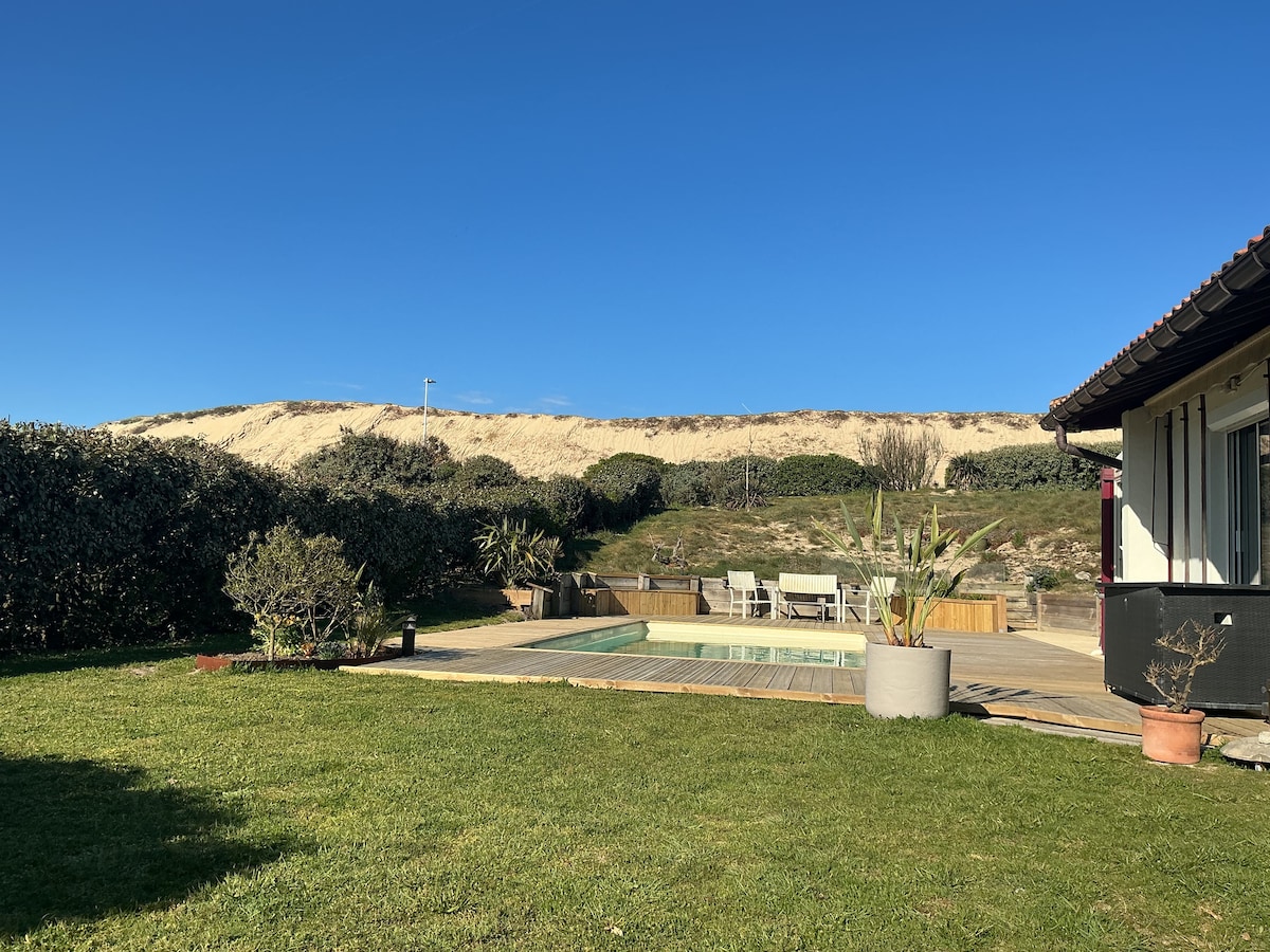 « KOLONAKI » Villa récente avec 200m2 de surface habitable, cuisine et salon 120 m2 ,vue sur la piscine chauffée sécurisée et forêt , ses 5 chambres 4 salles de bain , son jacuzzi 5 pax chauffé toute l’année et son coin plancha, douche et wc extérieur.parking de 3 places dans la propriété clôturée sécurisée . Située à 800 m des spots de surf, calme , discrète, en lisière de la forêt landaise( départ piste vtt . Localisation : 5 min à vélo des plages , 10 min voiture golf Seignosse